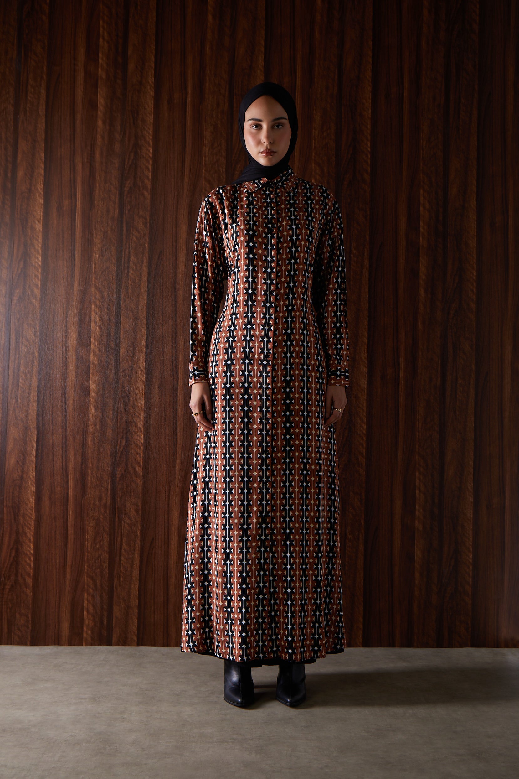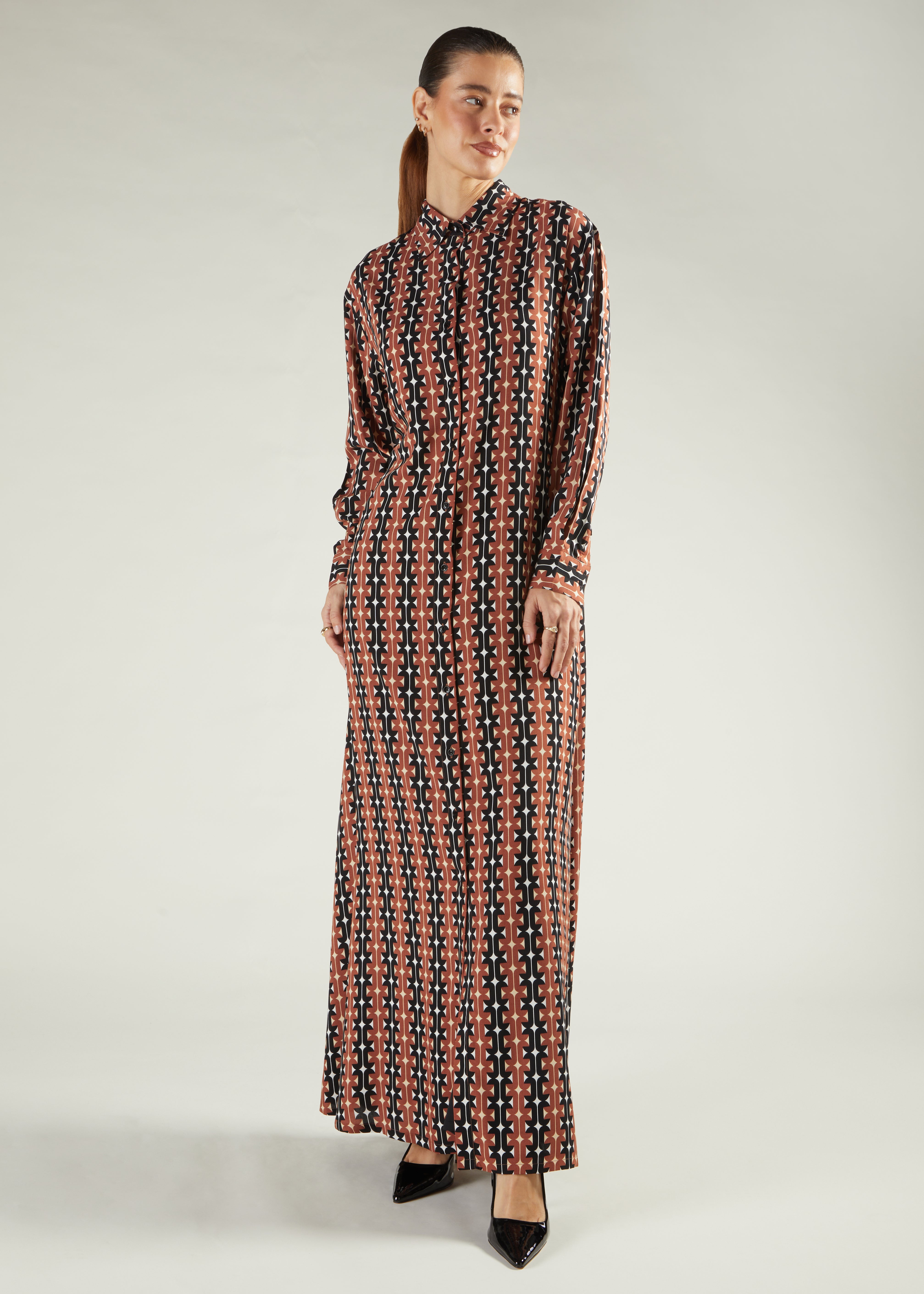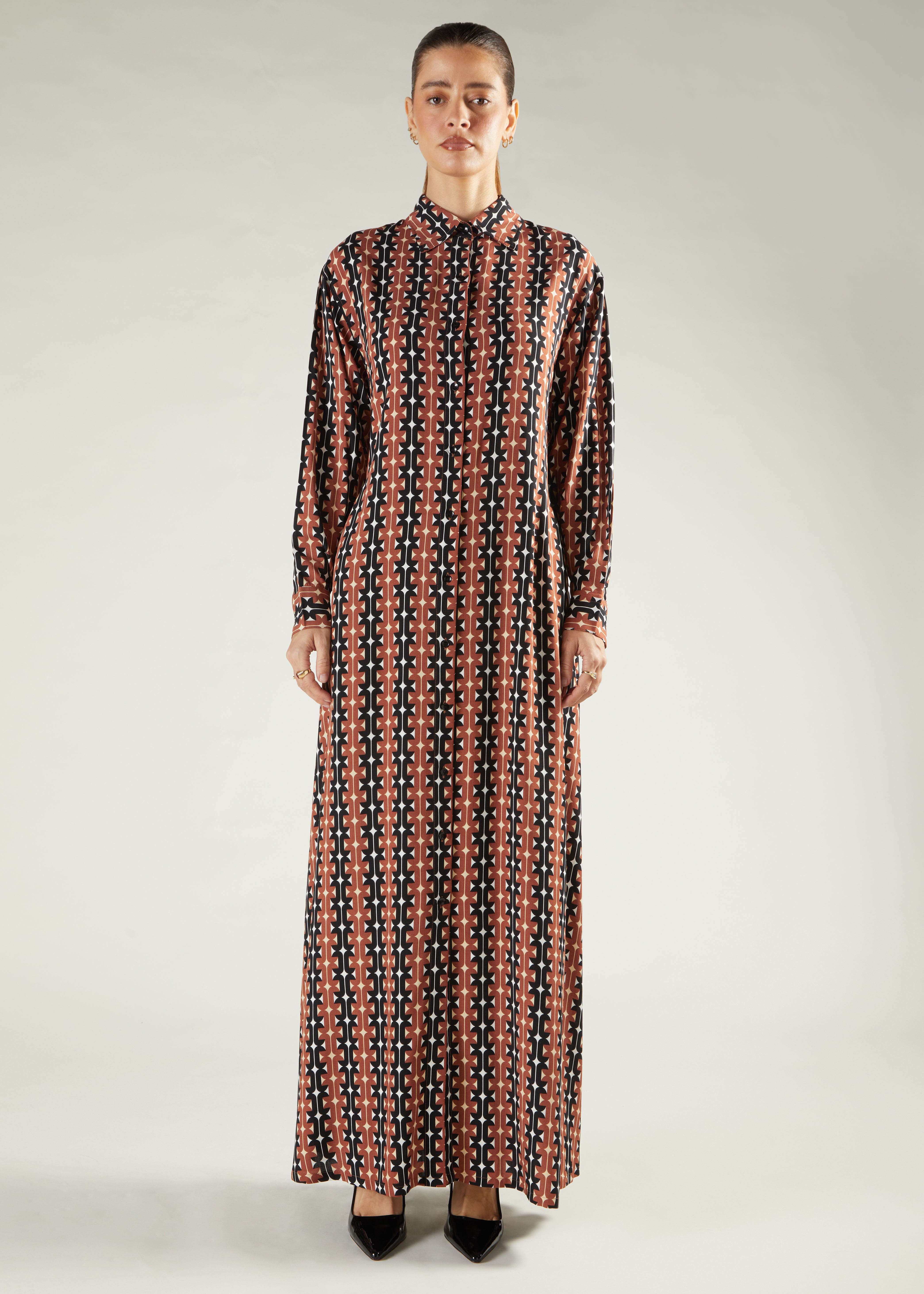 A retro print maxi made from a soft cotton fabric, cut in our classic shirted maxi style. It has full front button opening, comes with a detachable belt, features collars, cuffs and discreet side pockets.