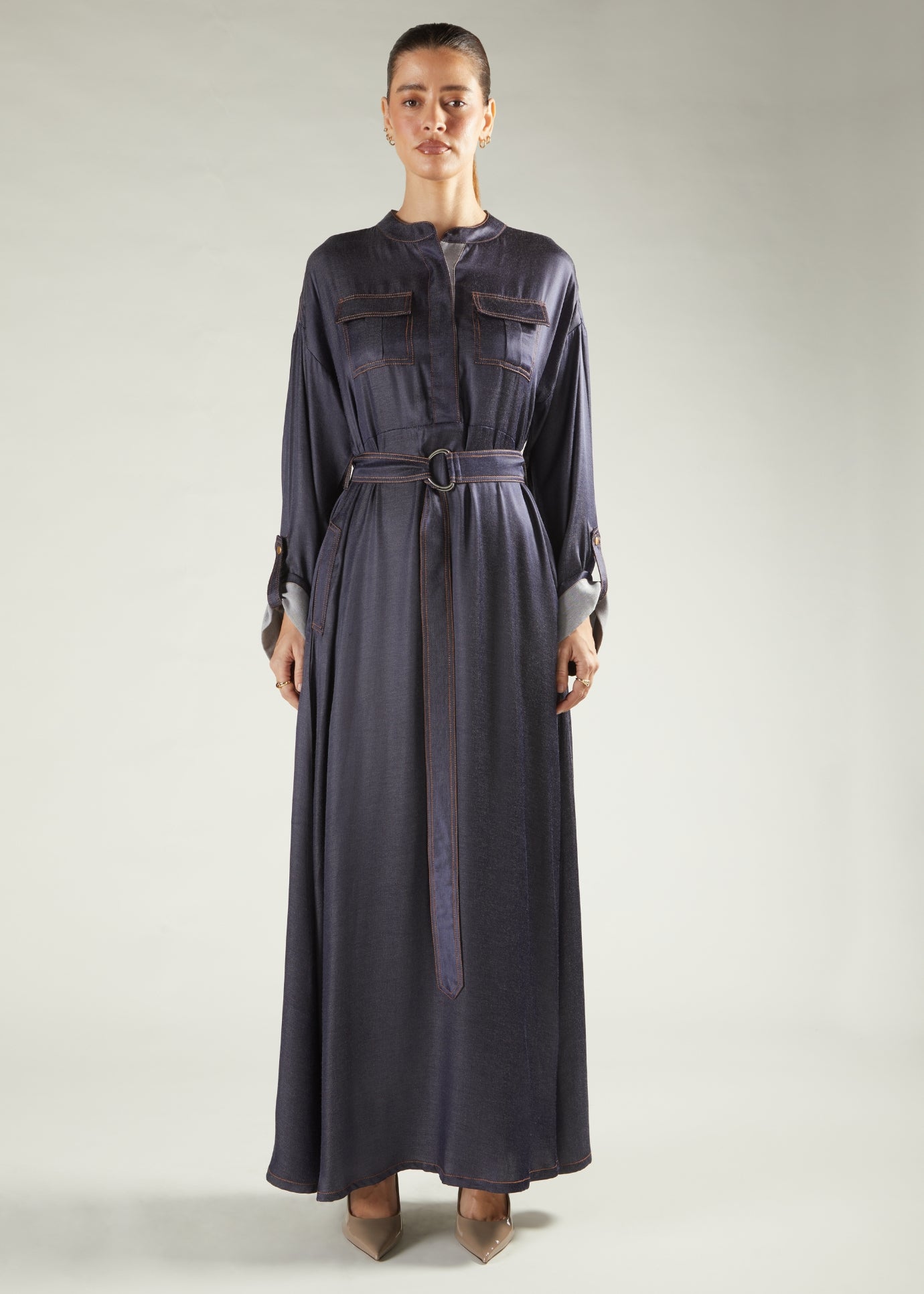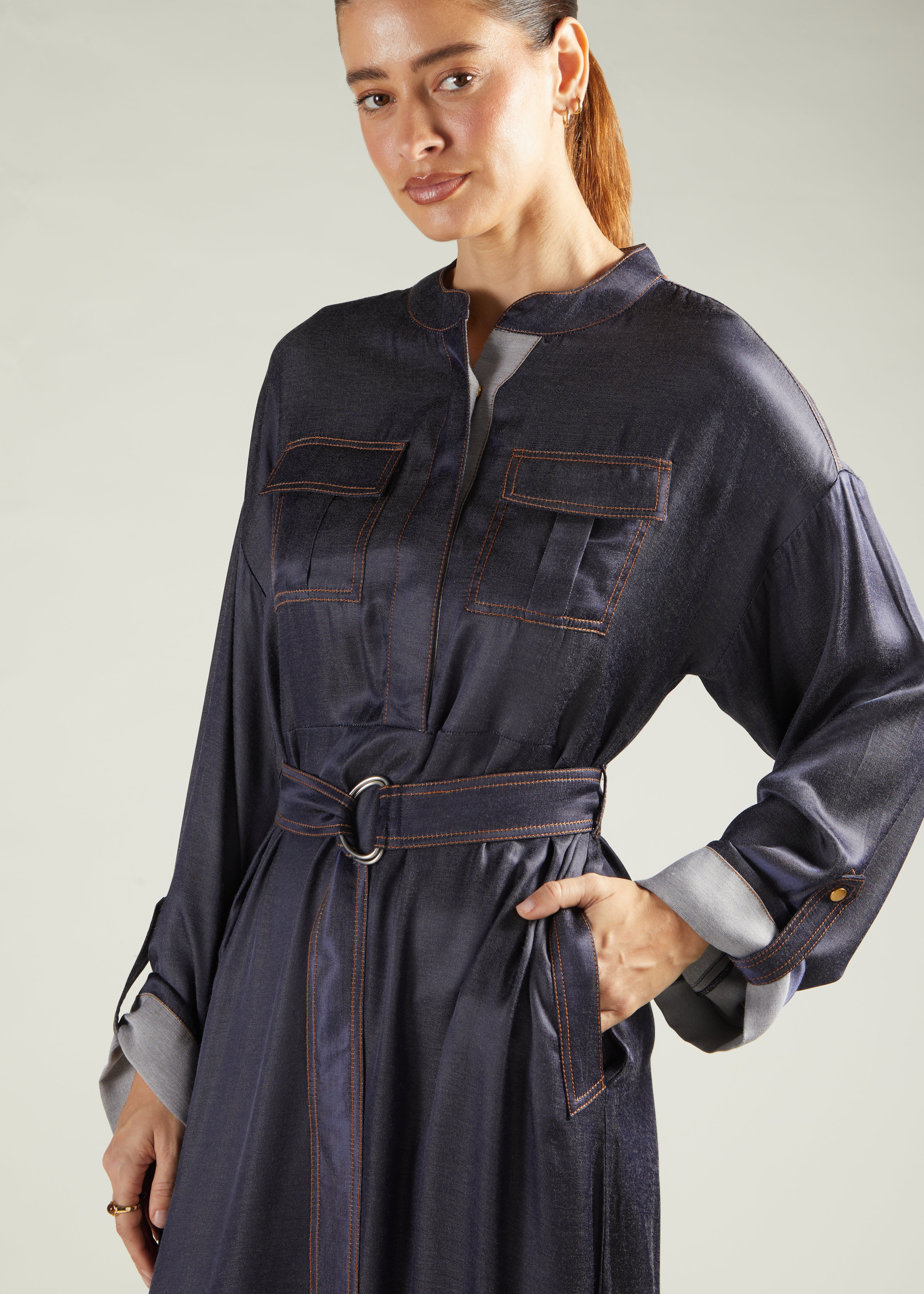 This long A line Maxi features classic denim rustic stitch around the utility inspired pockets and the self-fabric belt with a metal D buckle. The denim stitch features on the bodice and hem line as well as the neckline and cuffs, the sleeves have a turn up option with a gold snapper button.