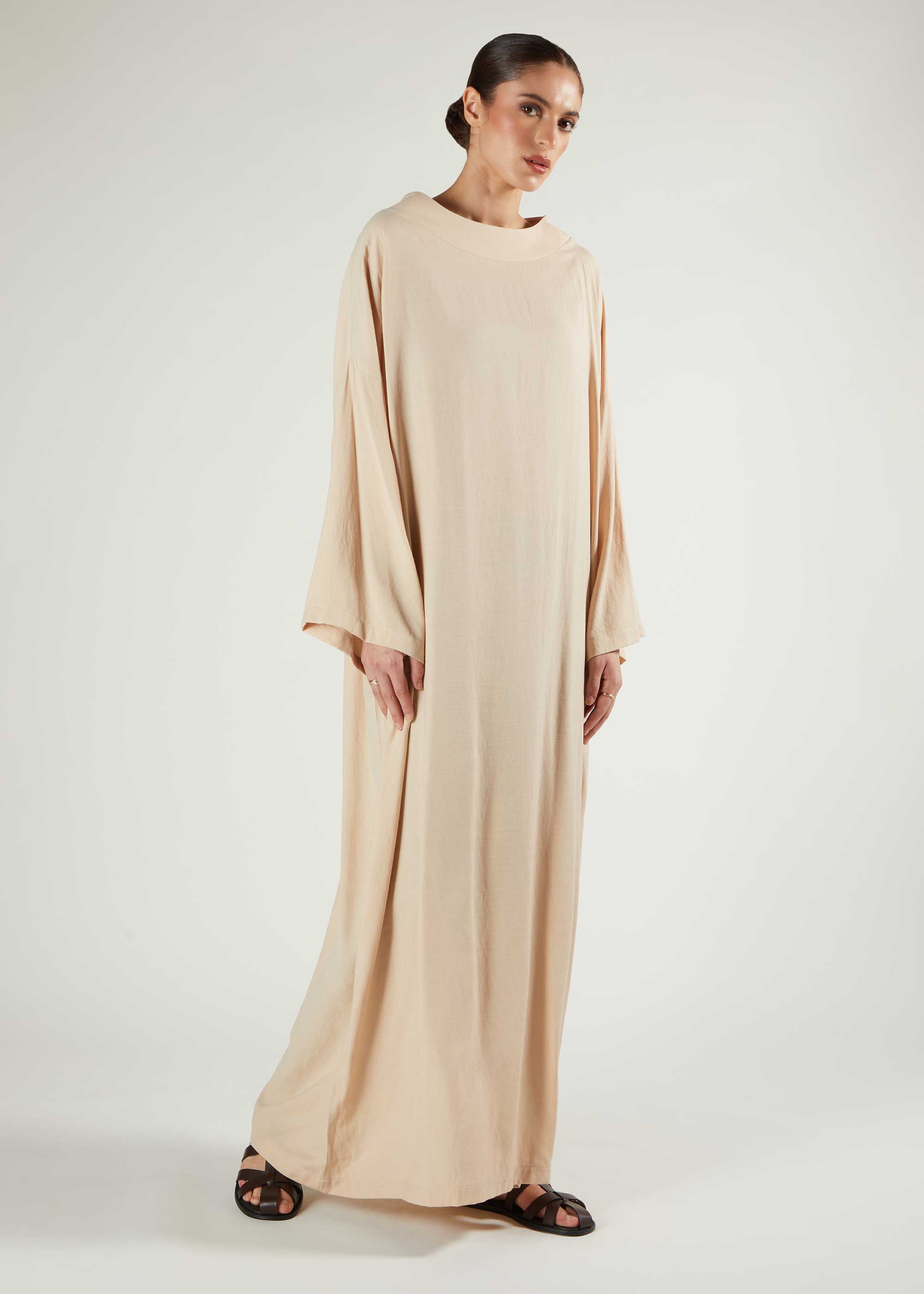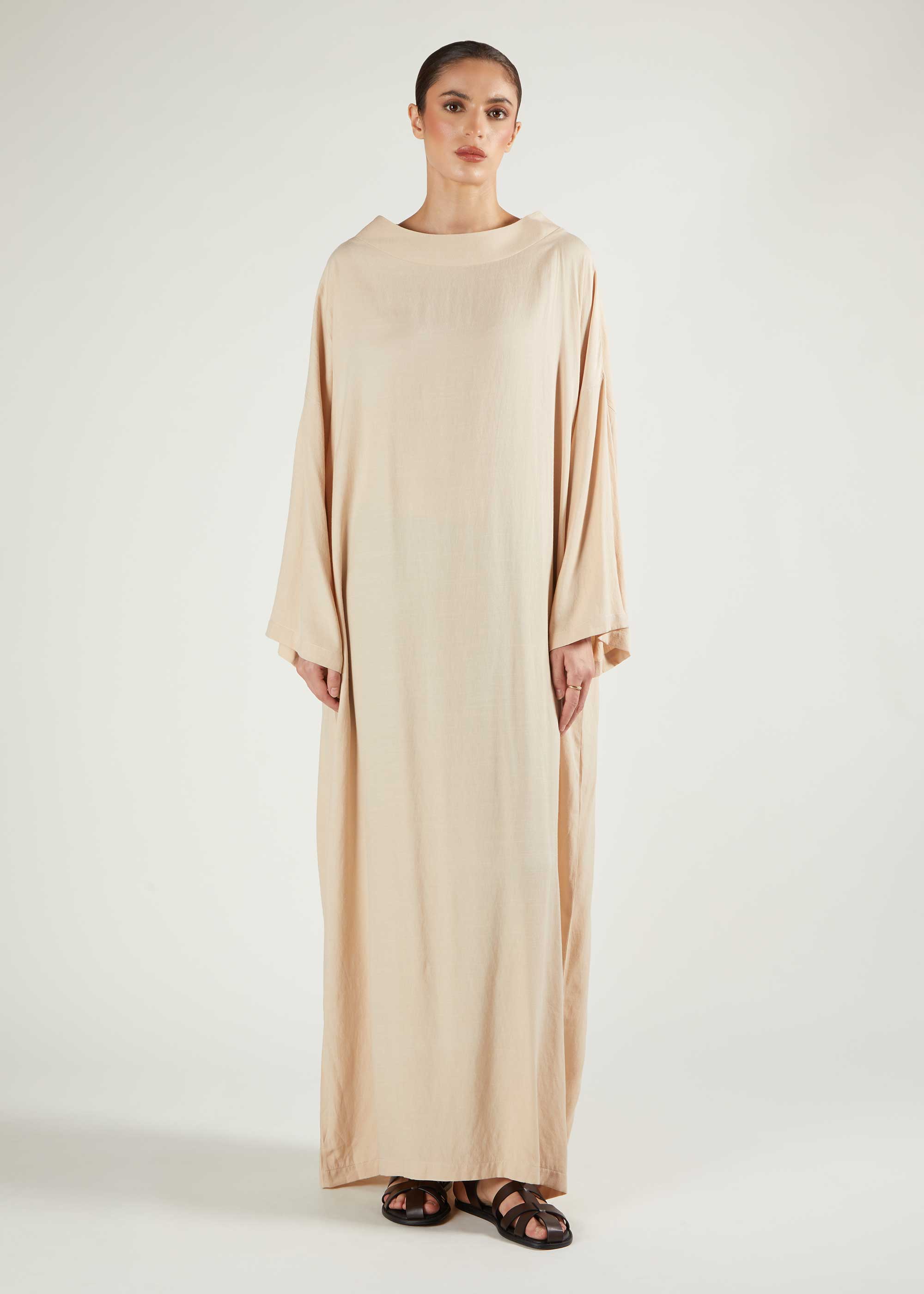 This abaya showcases a boat neckline and a modest, relaxed silhouette. Ideal for both home and travel, it seamlessly integrates into your daily wardrobe and works well for layering. It also includes subtle side pockets for added convenience.