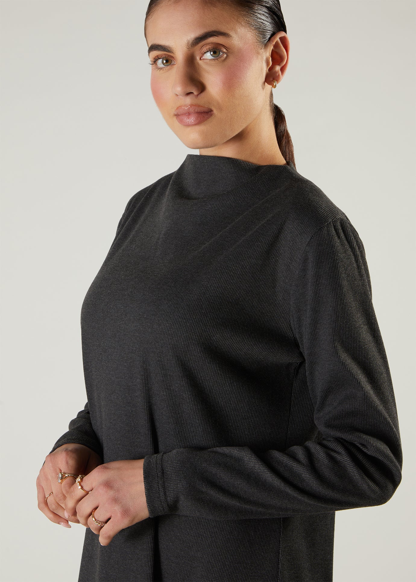Maxi is made from a ribbed fabric, it is full length with a boat neck detail, ideal for the cooler transitional weather.