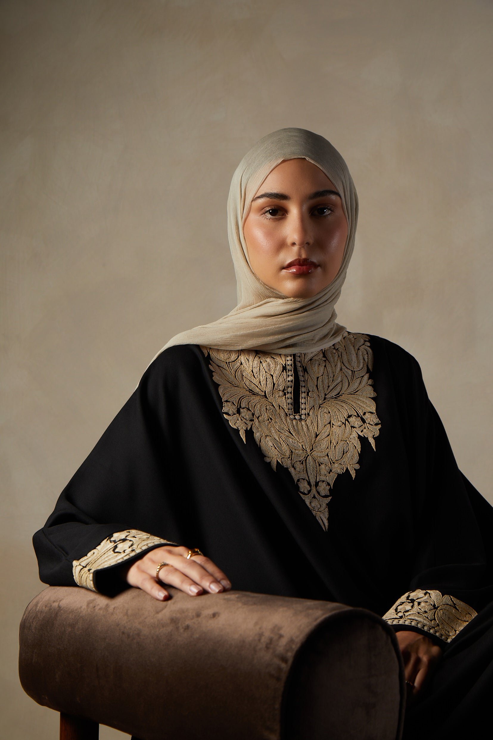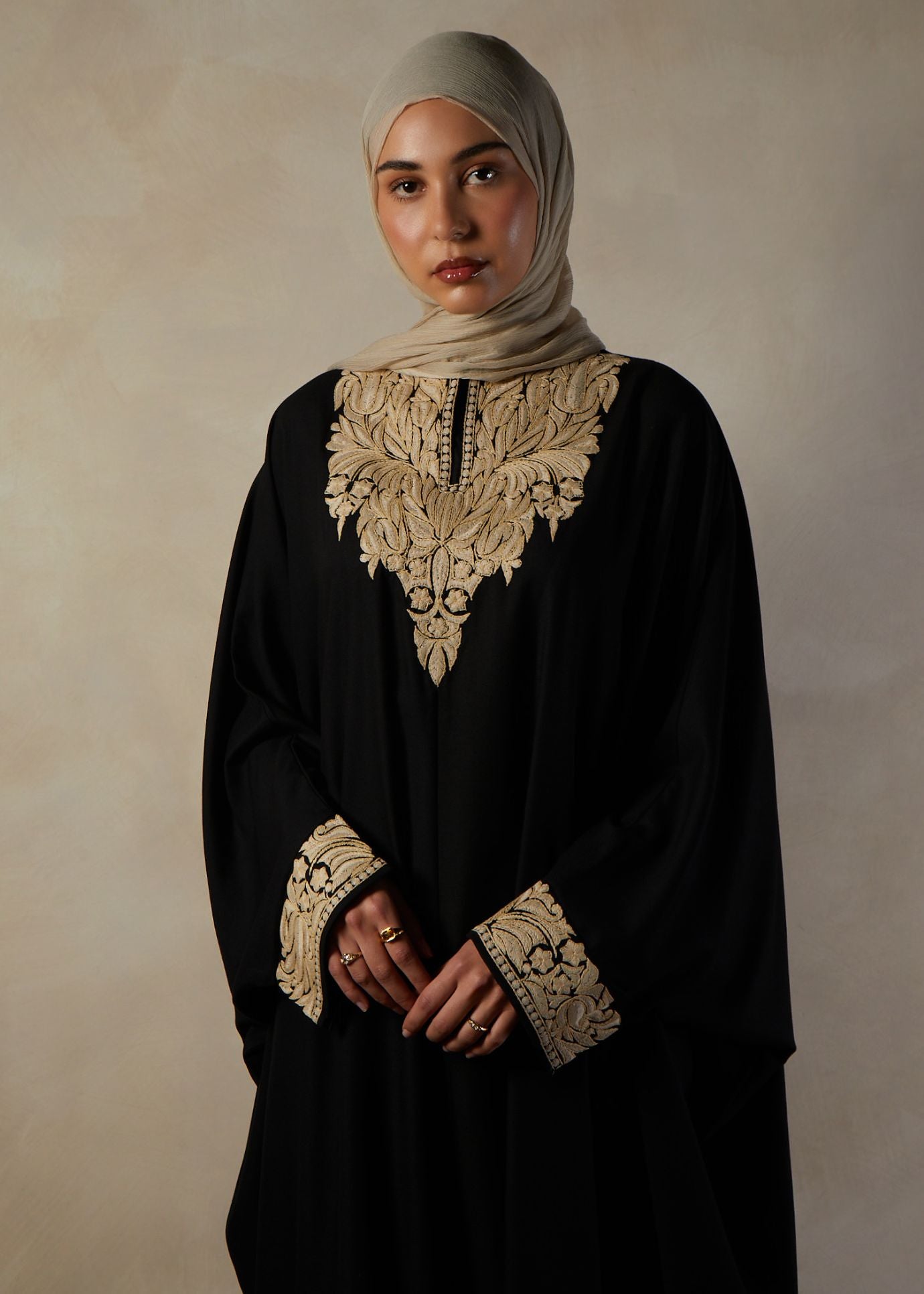 This Kaftan features stunning Sozni embroidery in subtle nude tones on the neckline and cuffs. With its loose yet modest silhouette, this kaftan is suitable for any occasion.