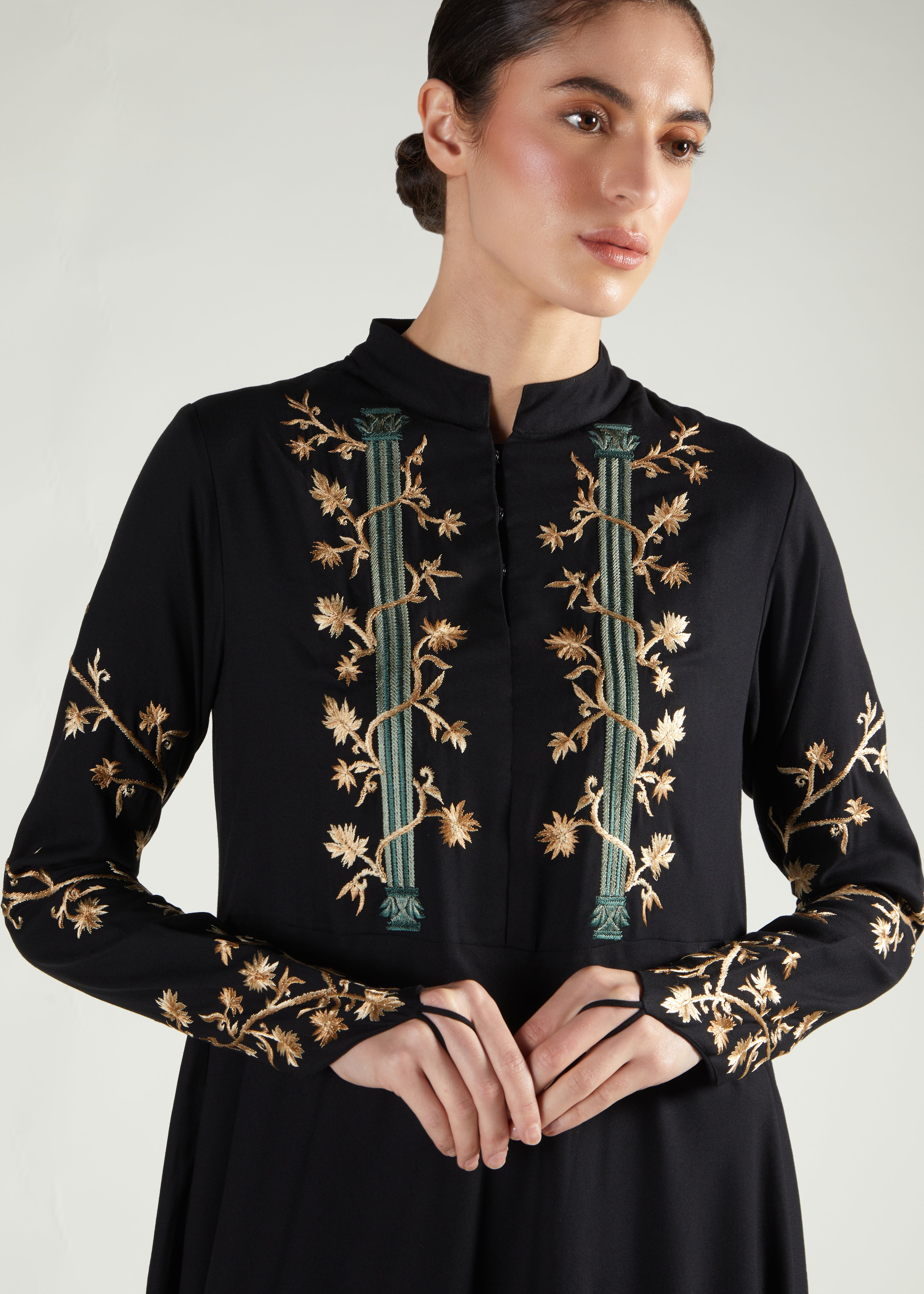 Our best-selling embroidered Abaya now available in black, Discover the exquisite abaya, designed with stunning embroidery that elegantly trails across the bodice and arms. This striking piece is the perfect choice for any special occasion. The bodice has concealed hooks and a sophisticated Mandarin neckline, while the fluid A-line cut ensures a flattering silhouette.