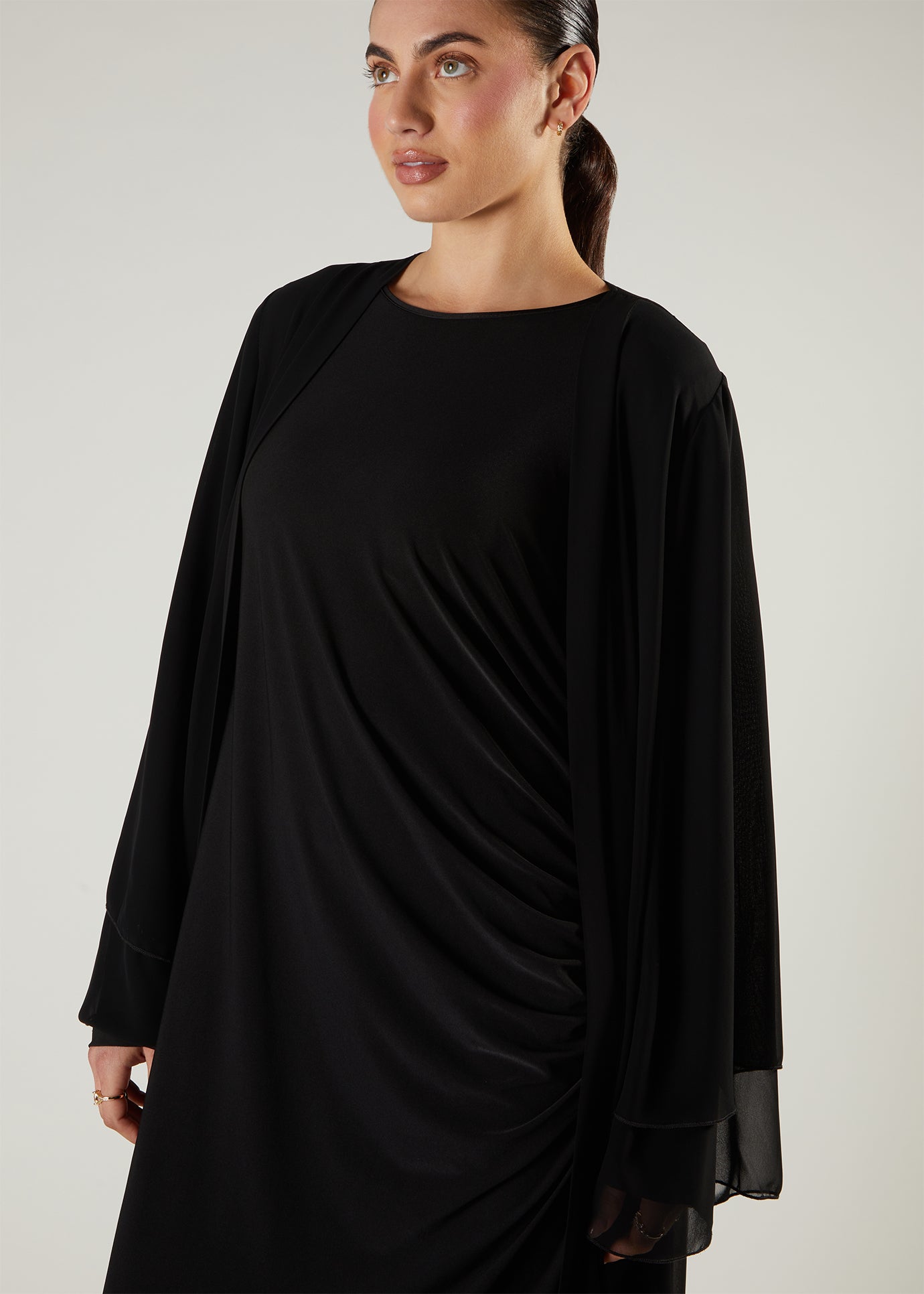 The inner slip is made from a fluid jersey fabric with a pleated side detail and comes with an elegant soft chiffon open abaya. Inner slip has a slim fit whilst the outer piece has a looser silhouette.