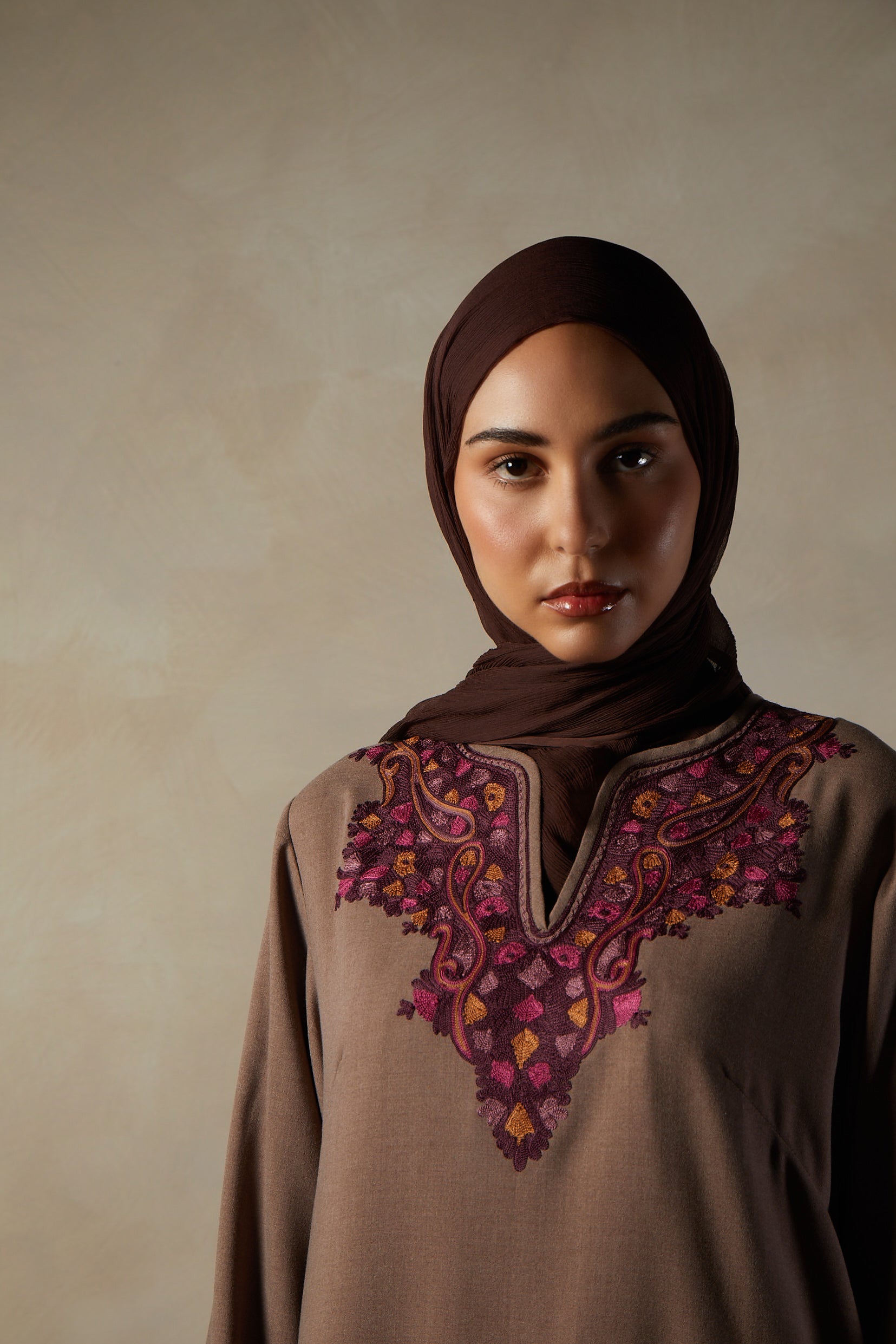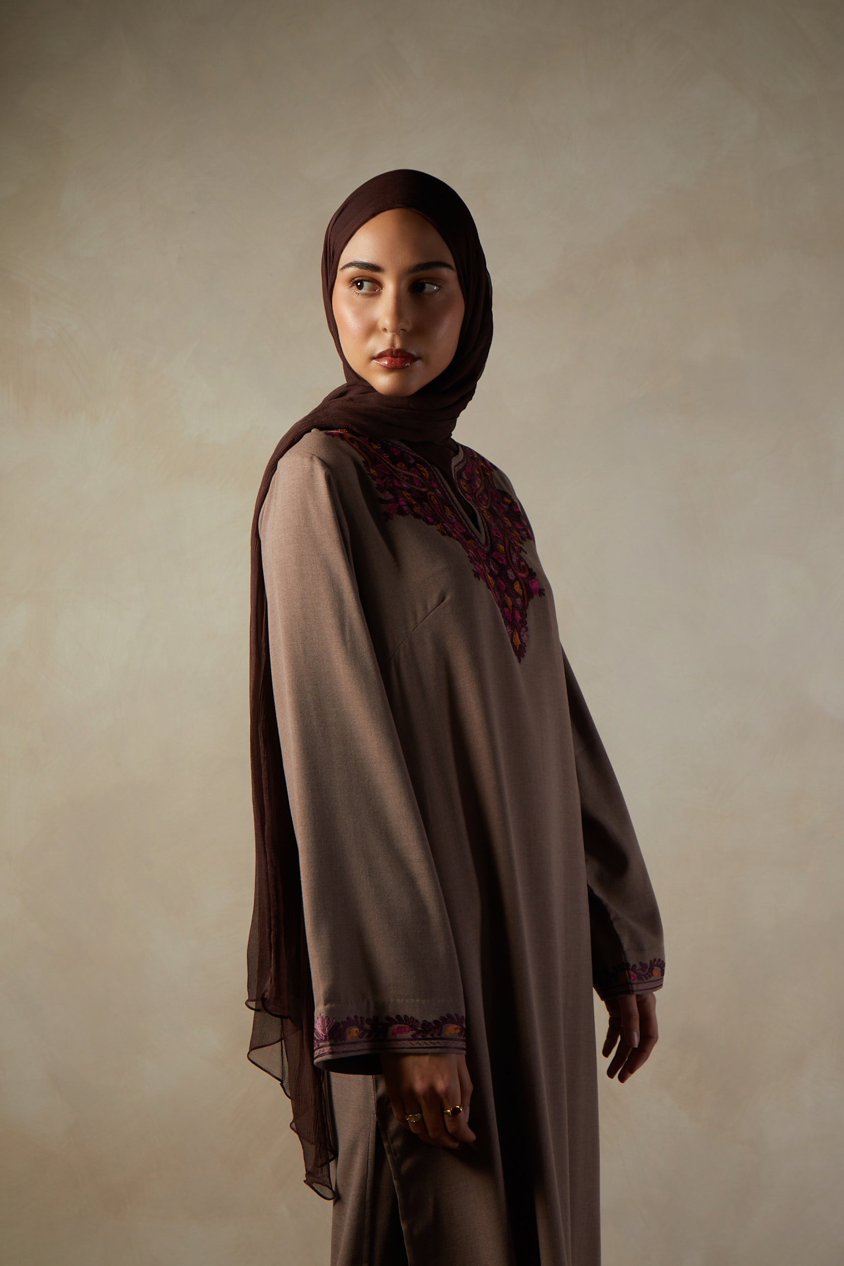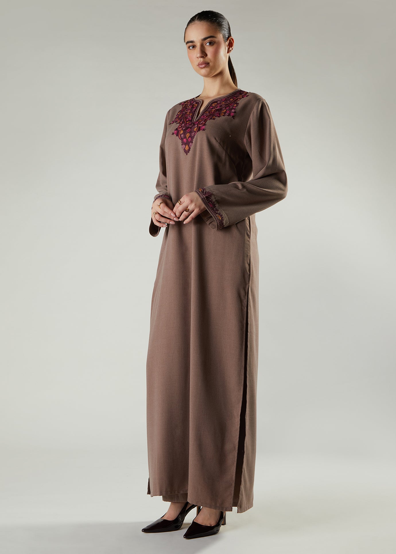 An A-line cut Abaya, featuring detailed Aari style embroidery in deep rich tones. The garment has a cosy look and is perfect for occasion wear. It features side slits for ease of movement and discreet side pockets.