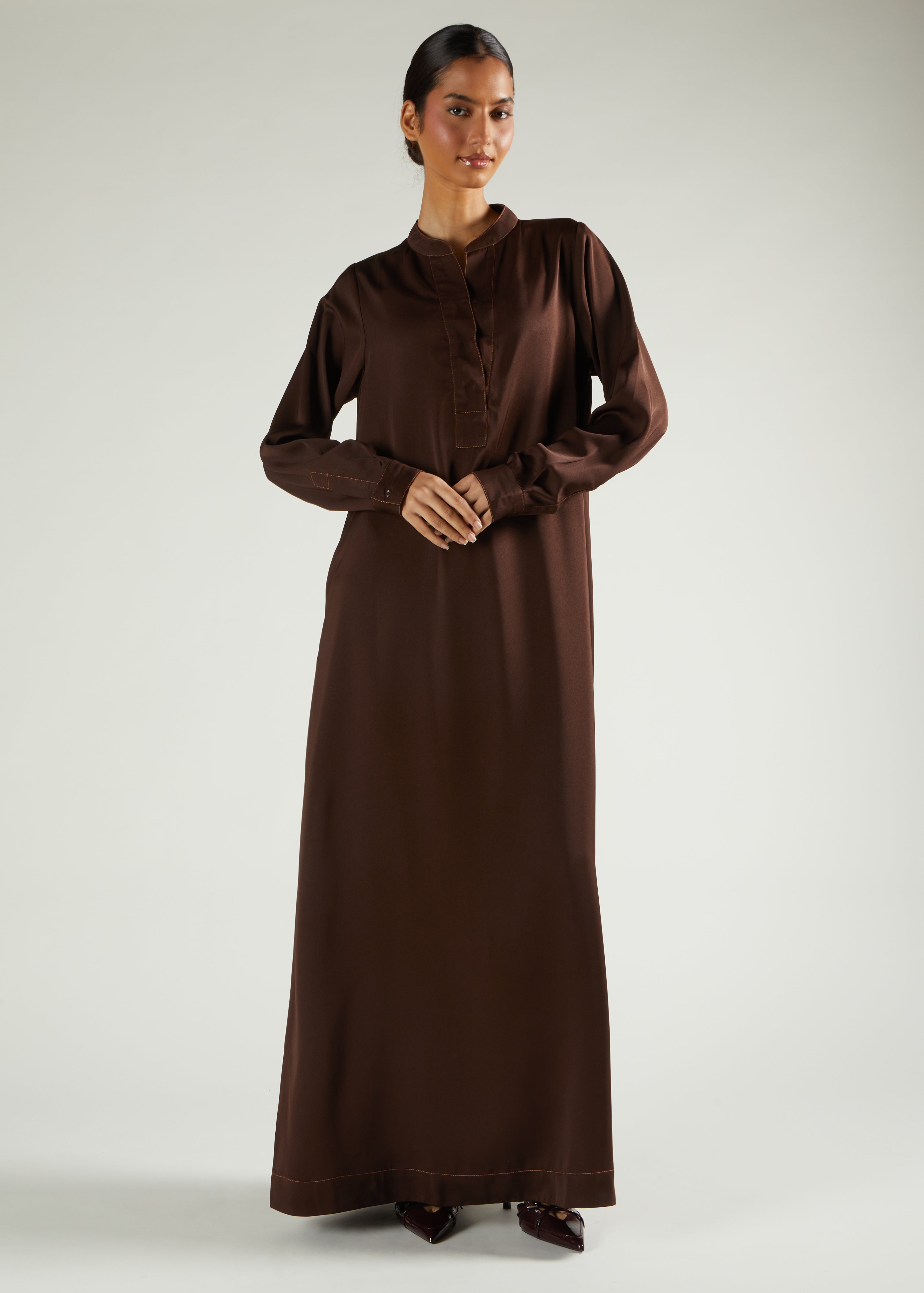 This abaya features a sleek contrast-coloured single line stitch along the front seam, cuffs, neckline and hemline, embodying refined simplicity and sophisticated elegance.