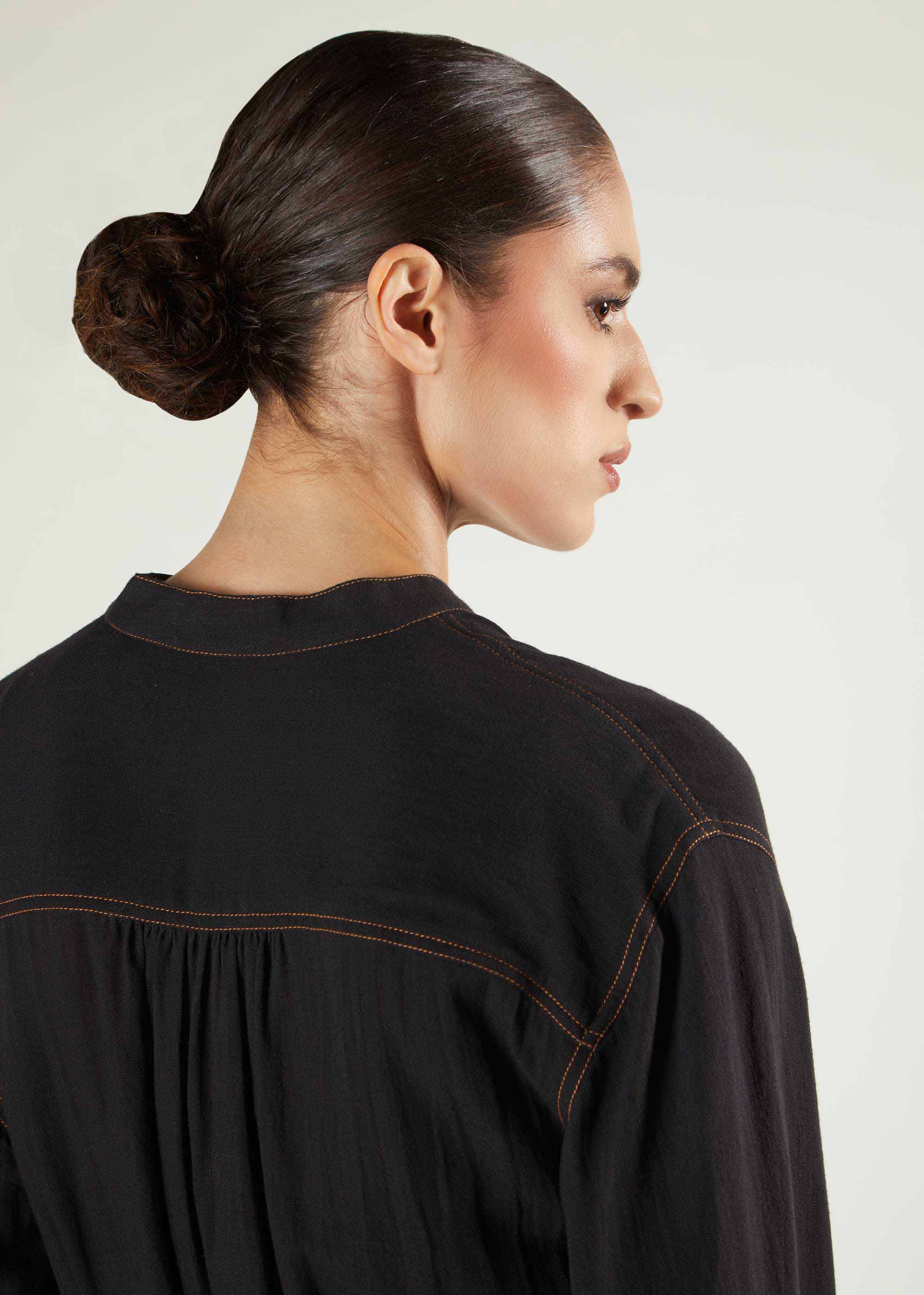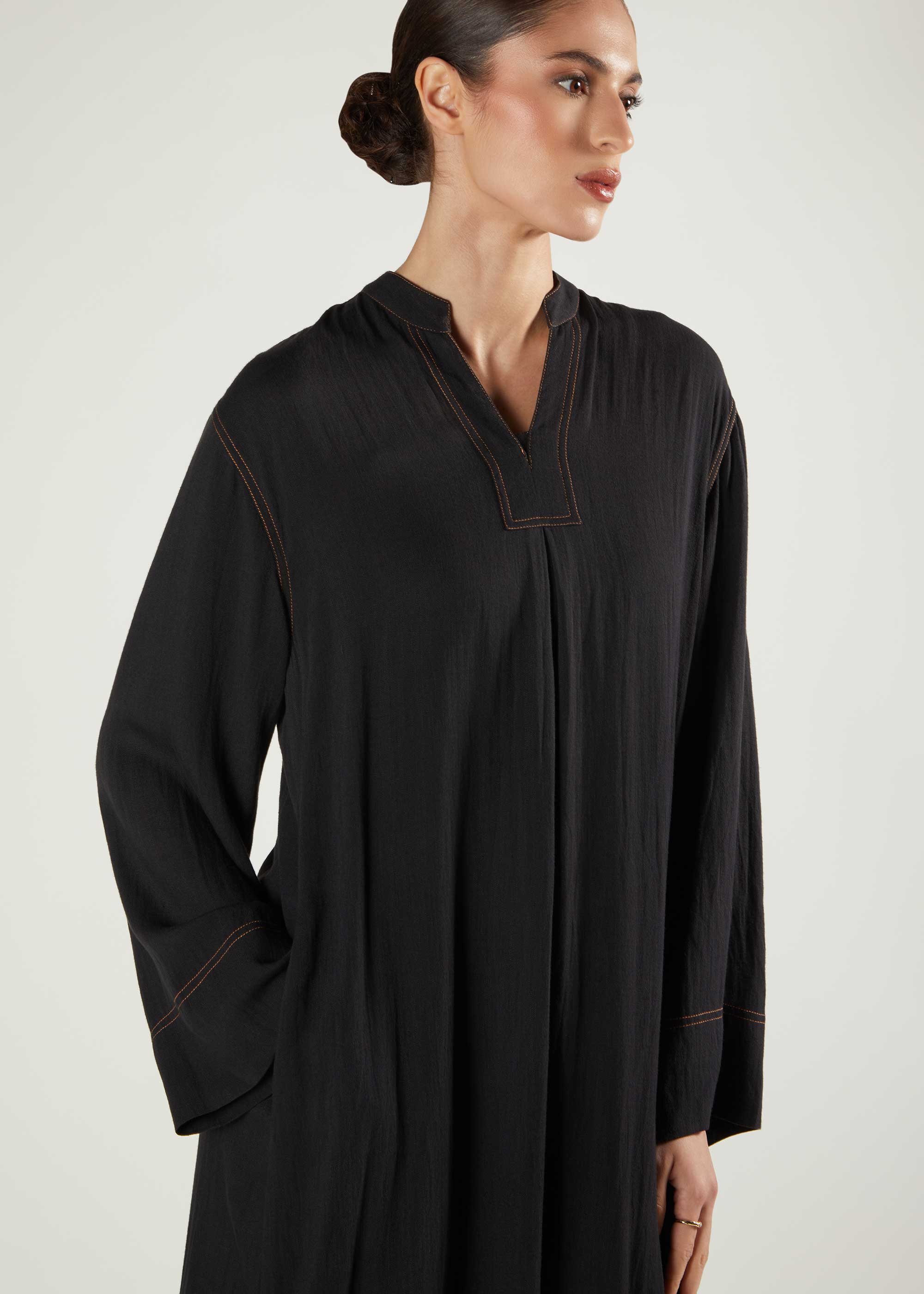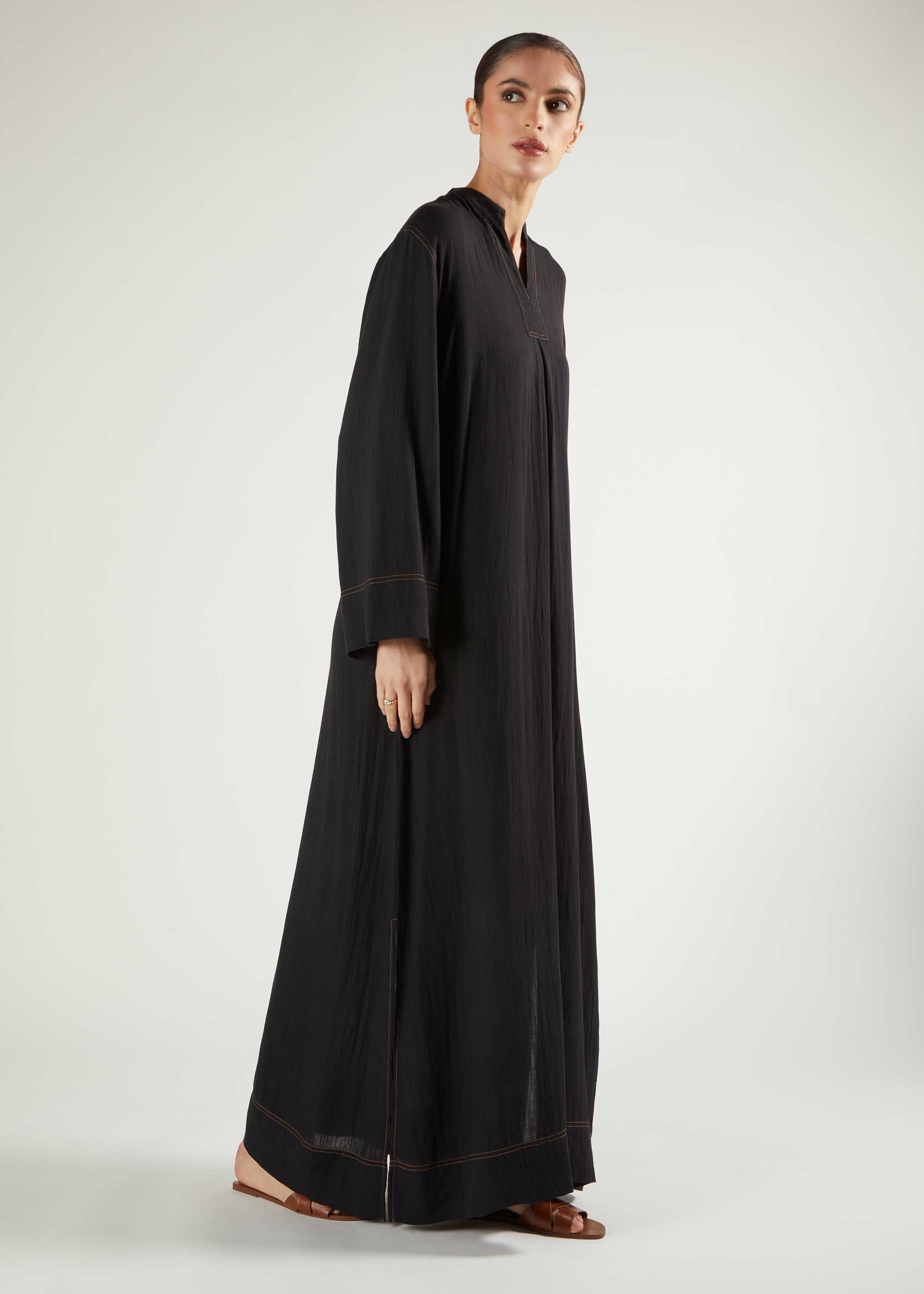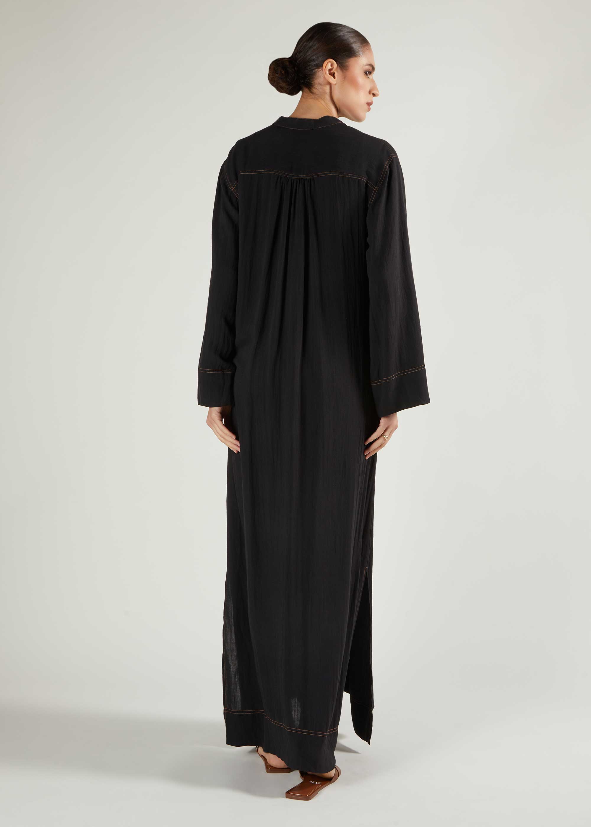 This casual maxi dress features timeless denim stitching along the neckline, hem, back, and cuffs. Designed with wide sleeves and short side slits, its pleated back adds a modest volume for a refined silhouette. Made from soft, draping fabric, it ensures a comfortable fit without clinging to the body, making it an ideal choice for everyday wear with a sophisticated yet relaxed appeal.
