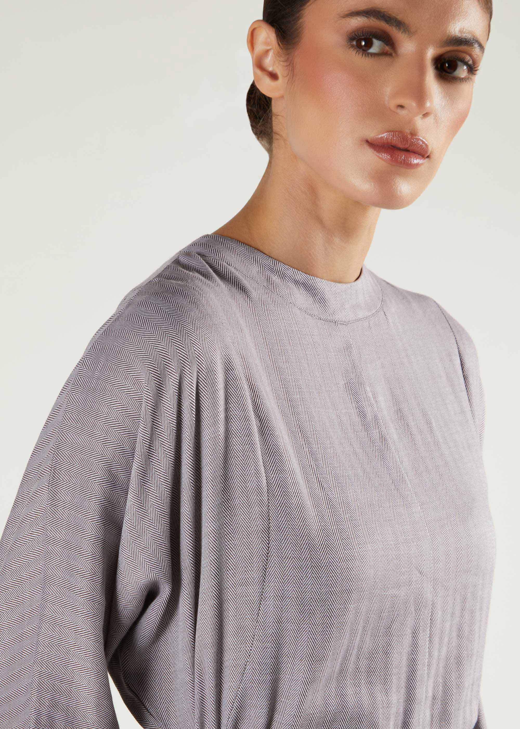 This abaya features a herringbone woven pattern made from mid-weight fabric that offers comfort and a streamlined fit without adding bulk. It includes a subtly elevated neckline and a zip closure at the back. Perfectly suited for transitional seasons, it also layers effortlessly with other garments.