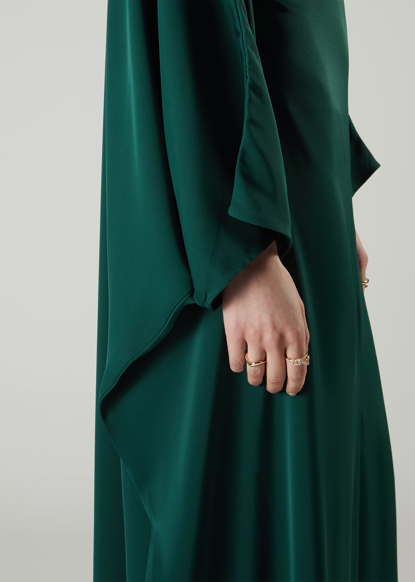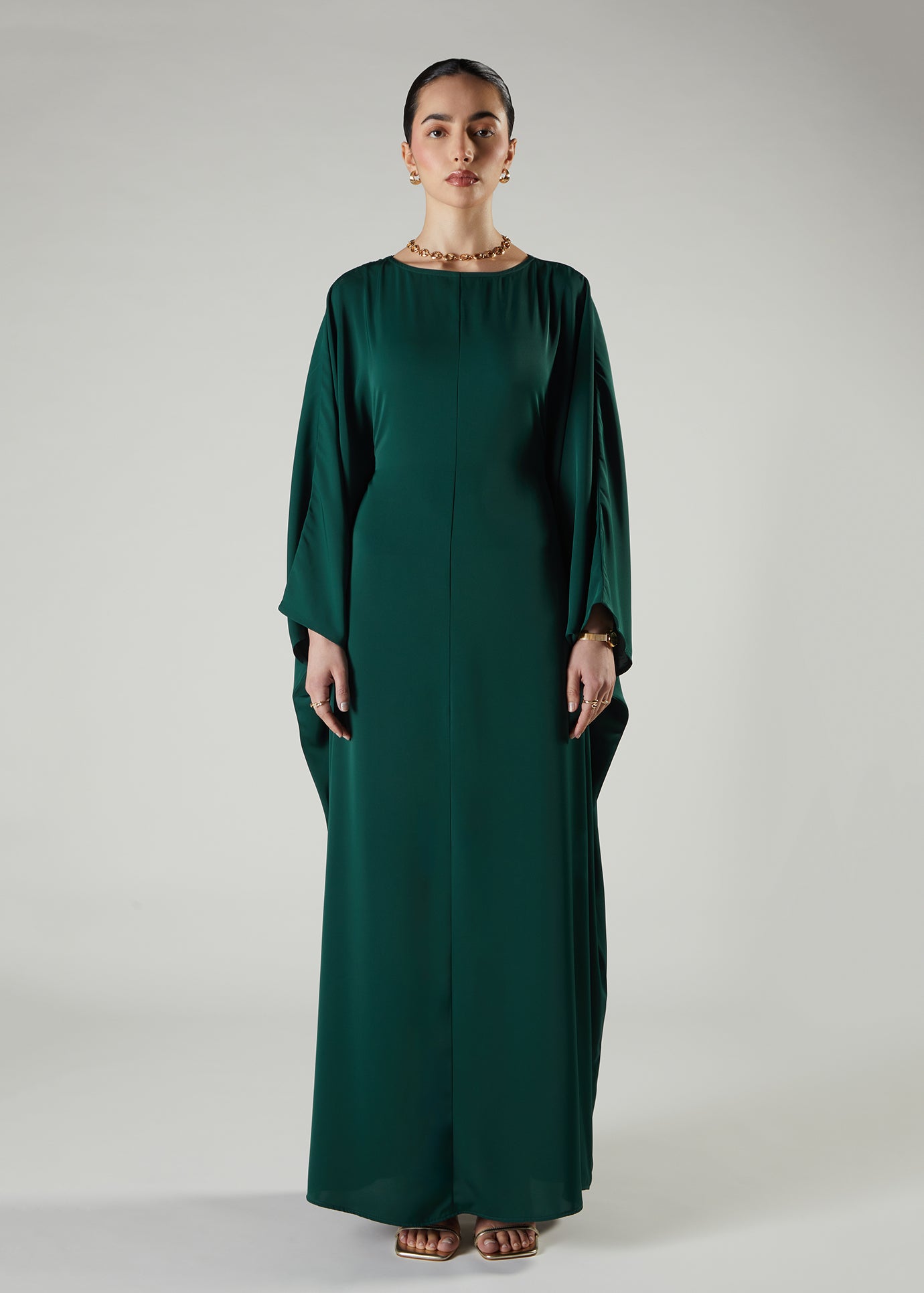 Soft satin-feel kaftan that features an inner belt to allow you to tie in to give shape if desired. The sleeves have a hidden button inside to stop the sleeves rising upwards and exposing your arms. A beautiful summery green kaftan perfect to wear for occasions.
