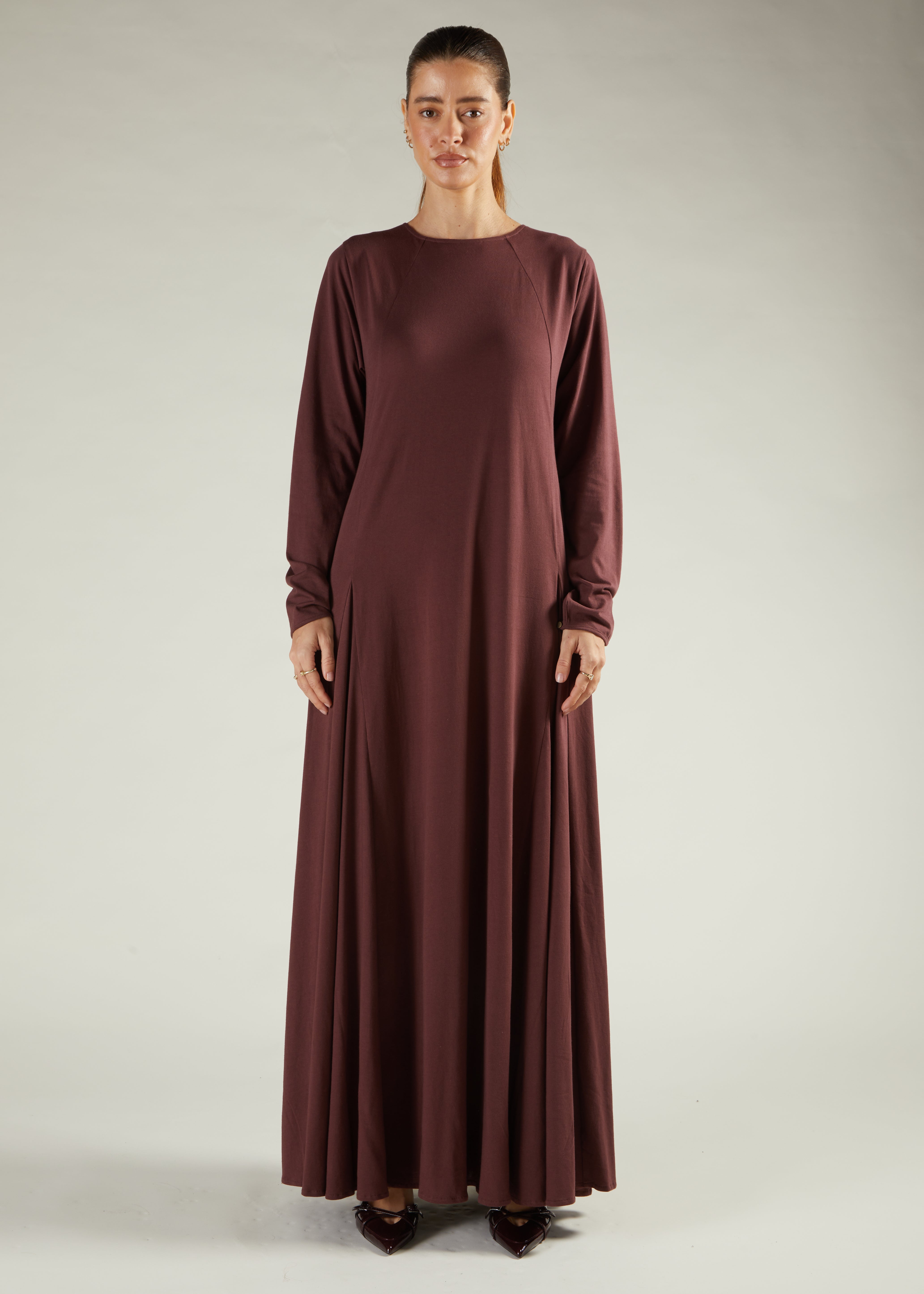 Abaya features a high neckline and and the seams offer a flattering fit with a flared skirt. Made from 100% cotton jersey, it allows for easy layering with outerwear.