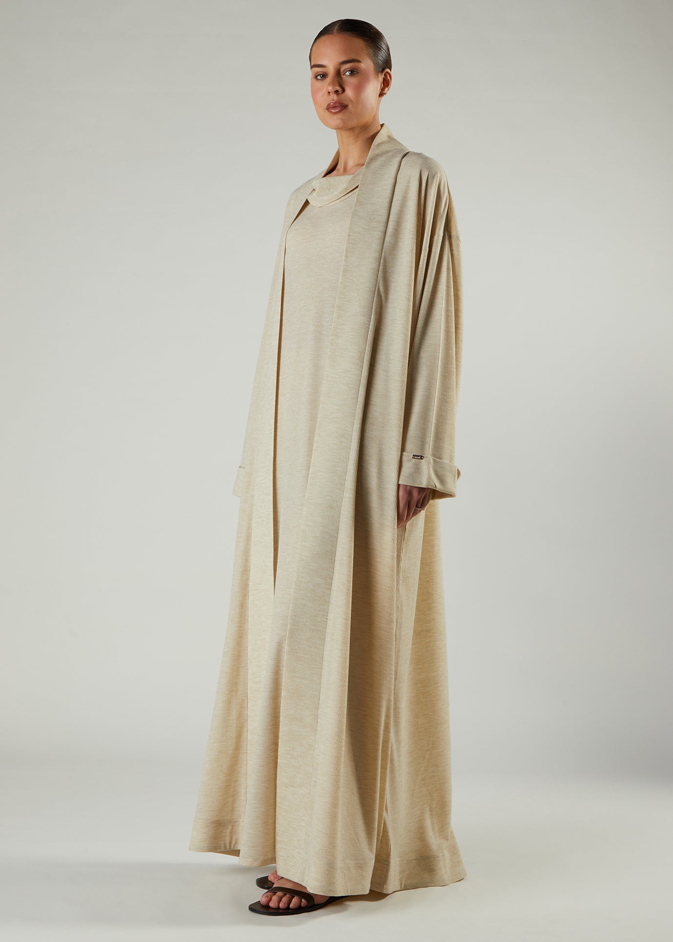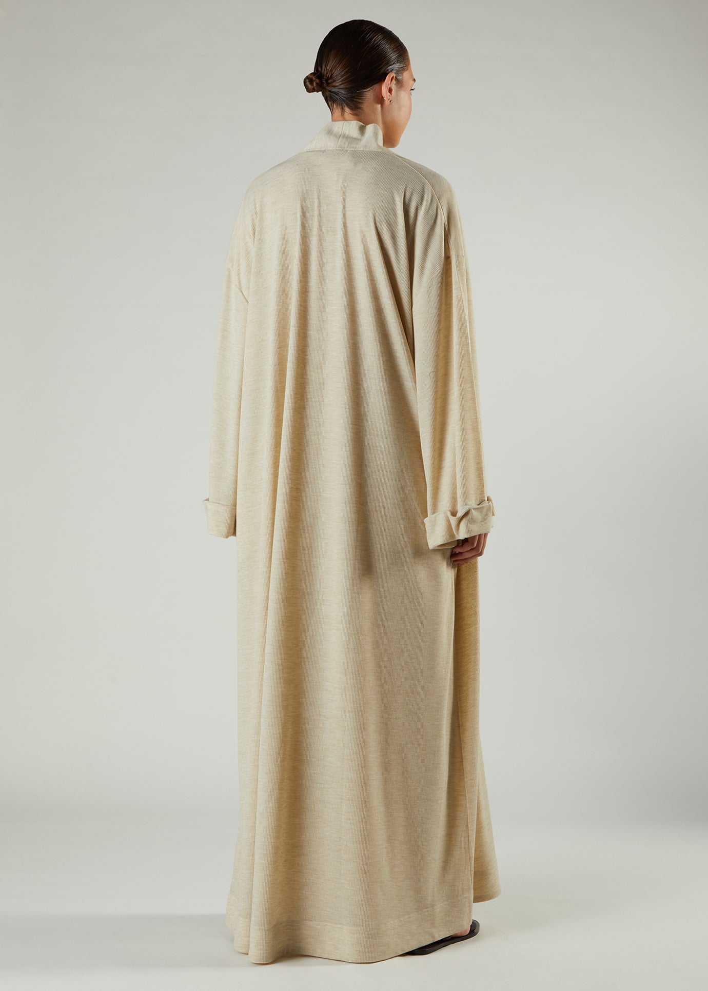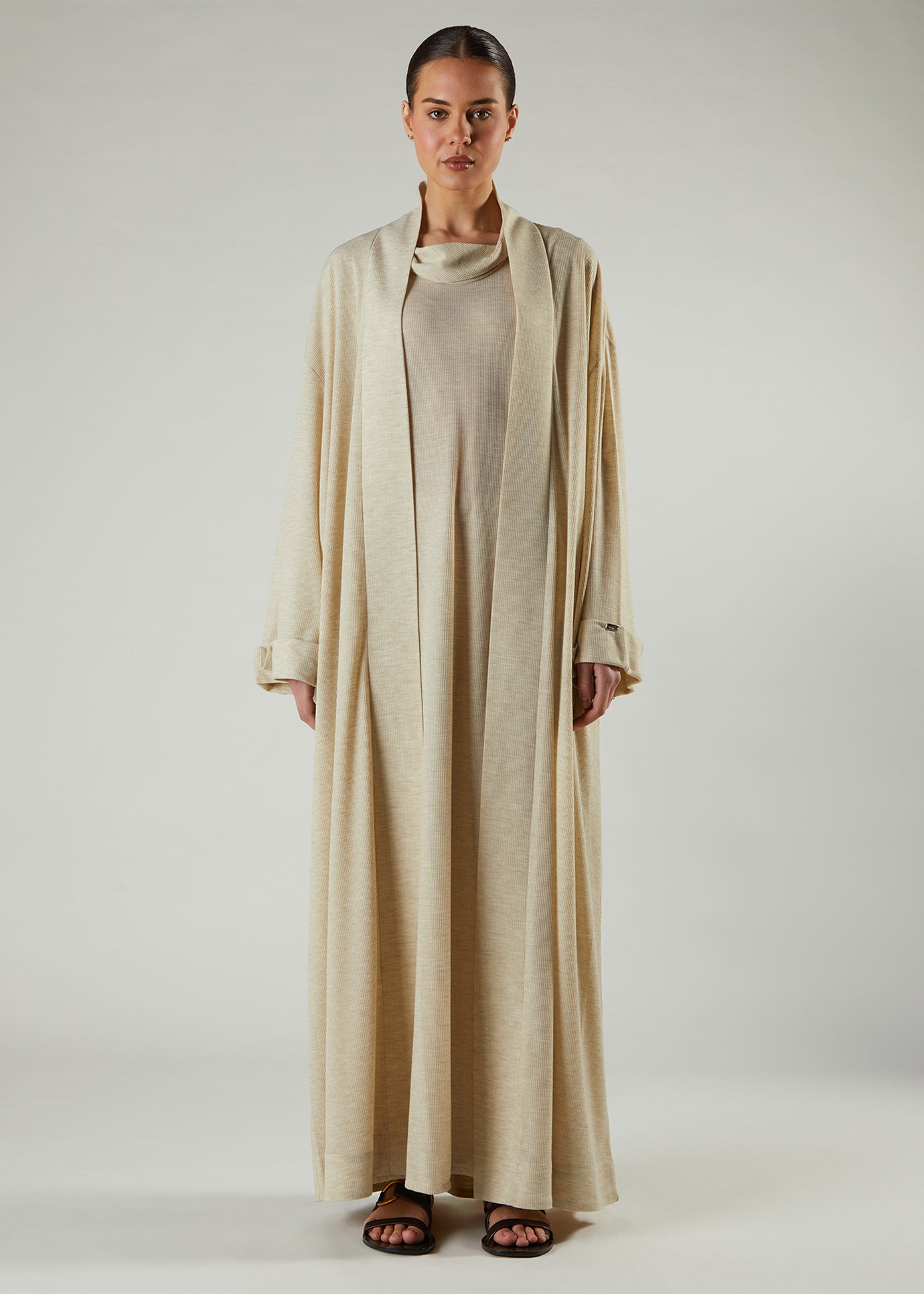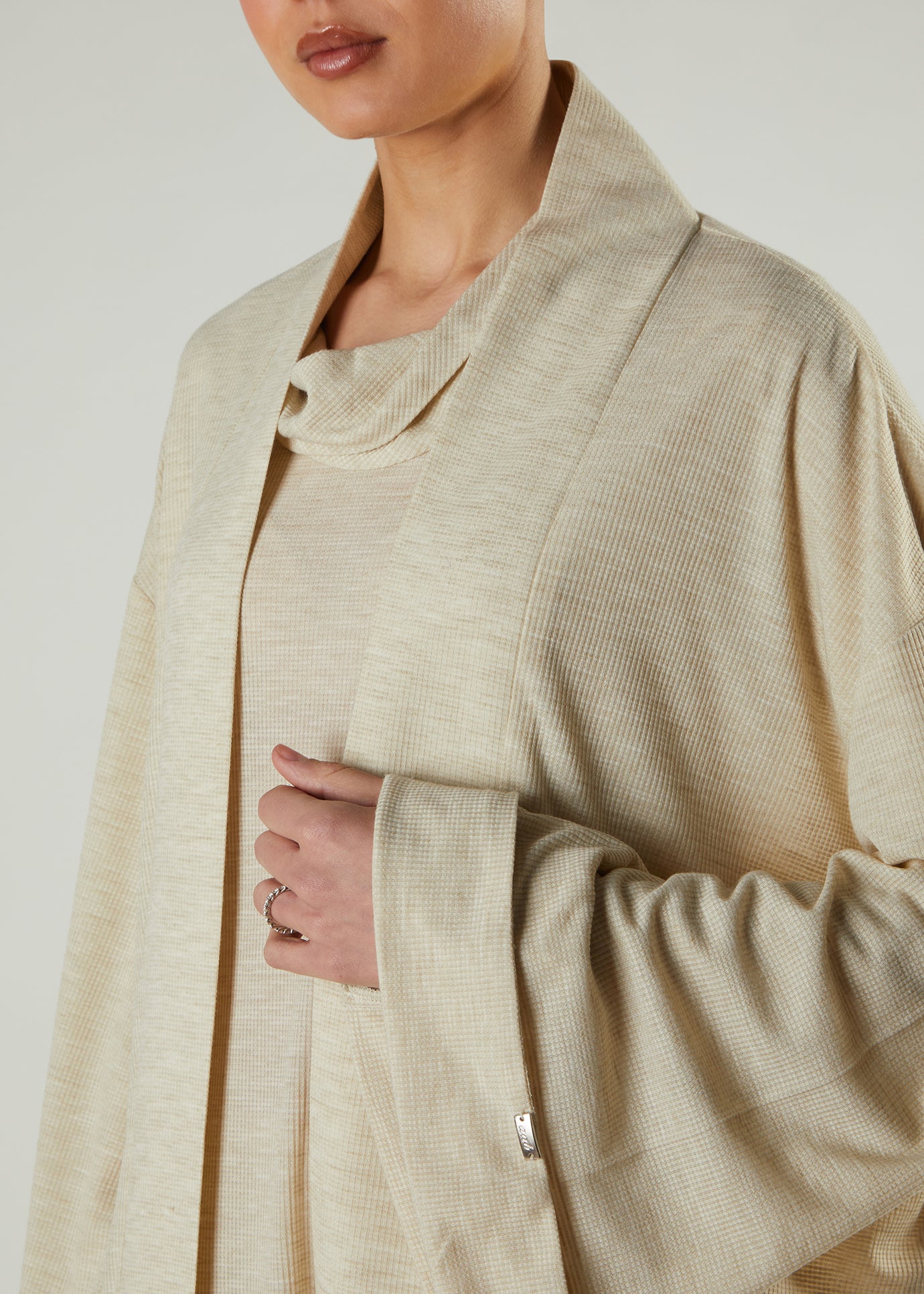 Knit style kimono that features wide sleeves and a looser silhouette, we recommend opting for your usual size. Great to throw over your outfits and pairs well with the High Neck Knit Abaya.