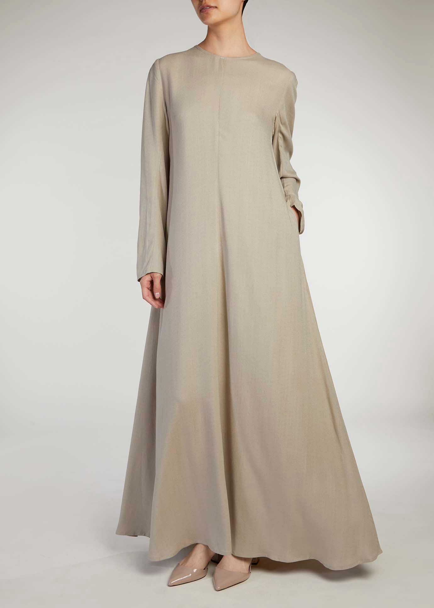 A simple easy to style and easy to wear Longline Abaya perfect for everyday wear. Featuring a single seam running along the middle of the Abaya & long semi fitted sleeves.