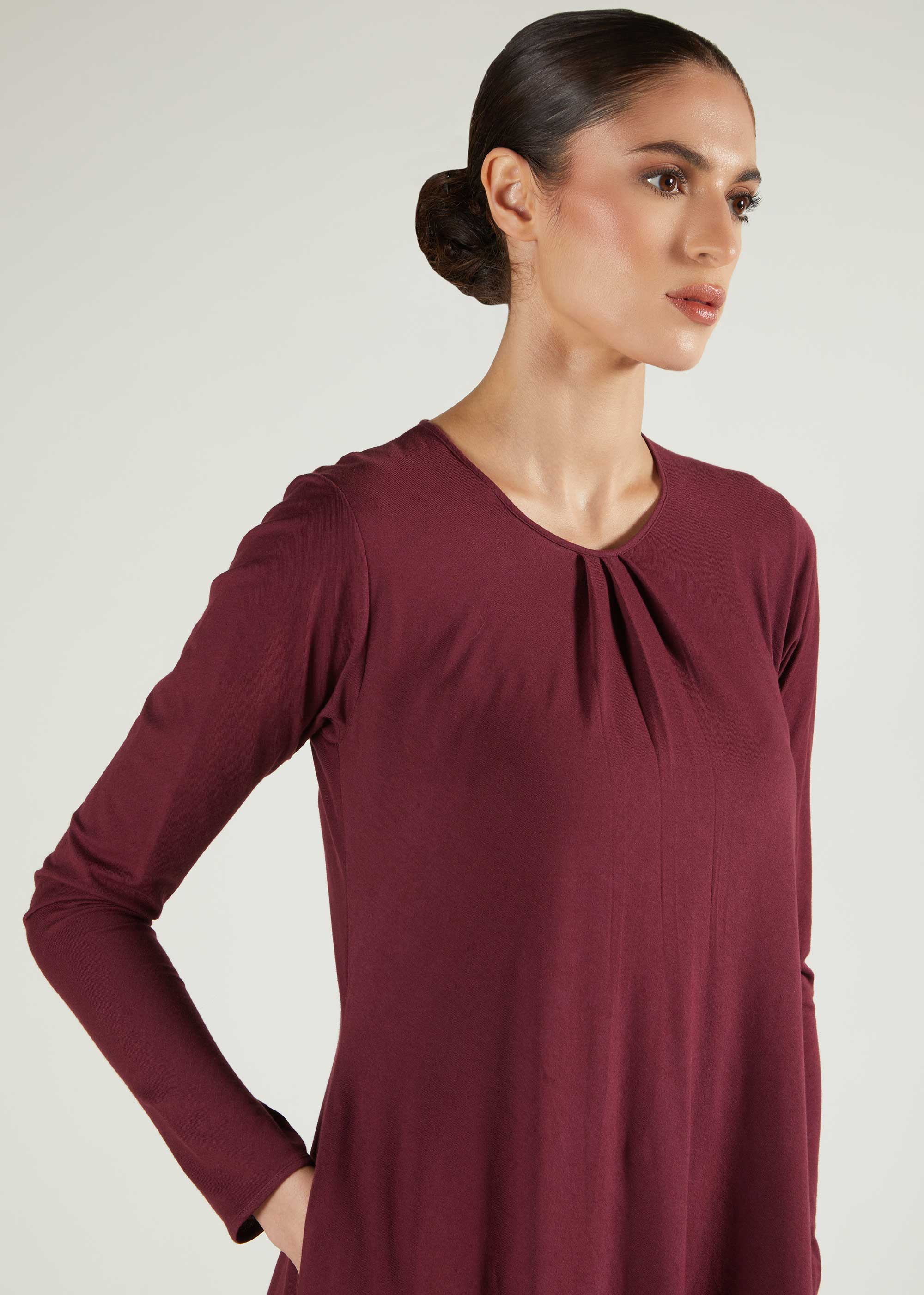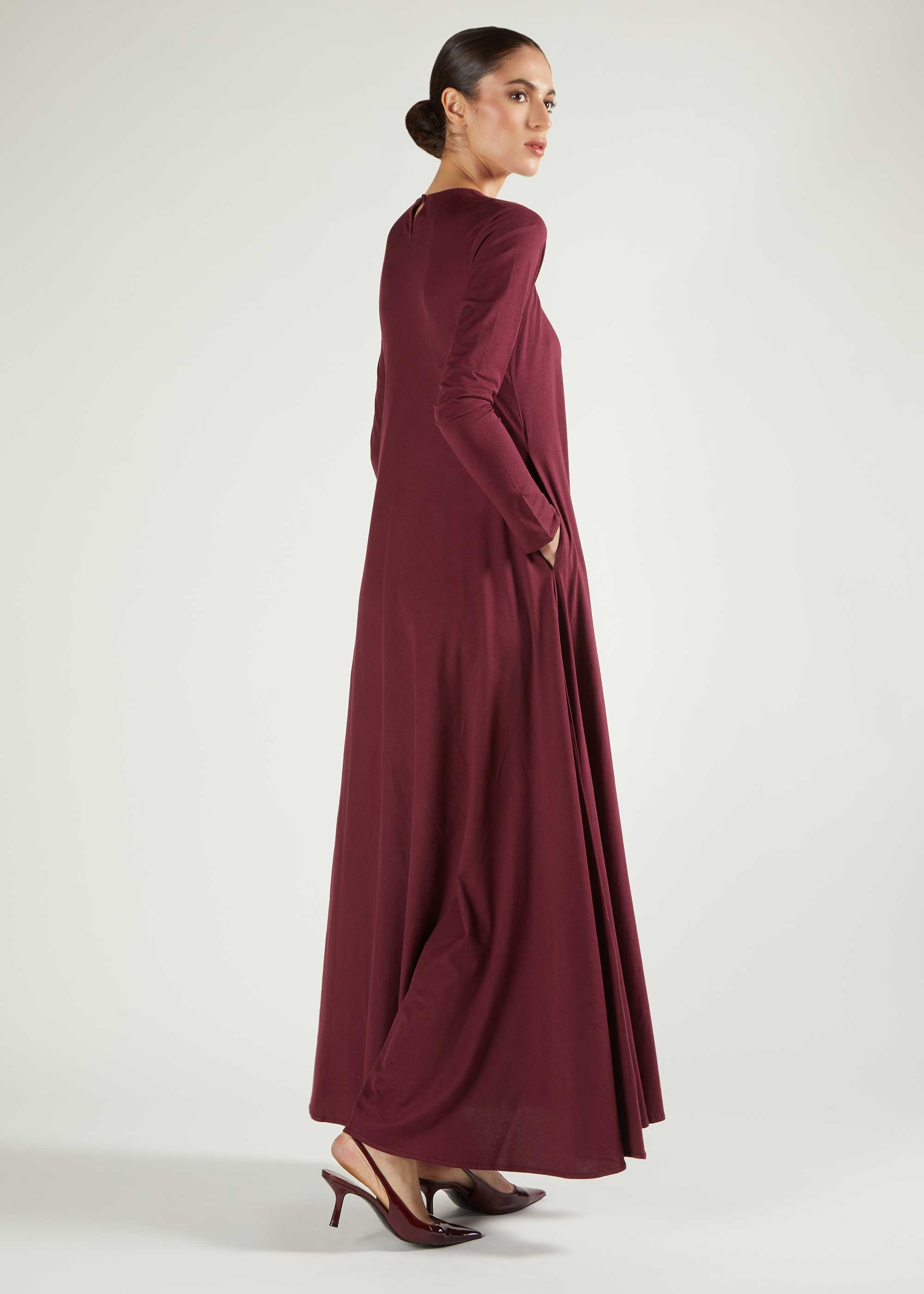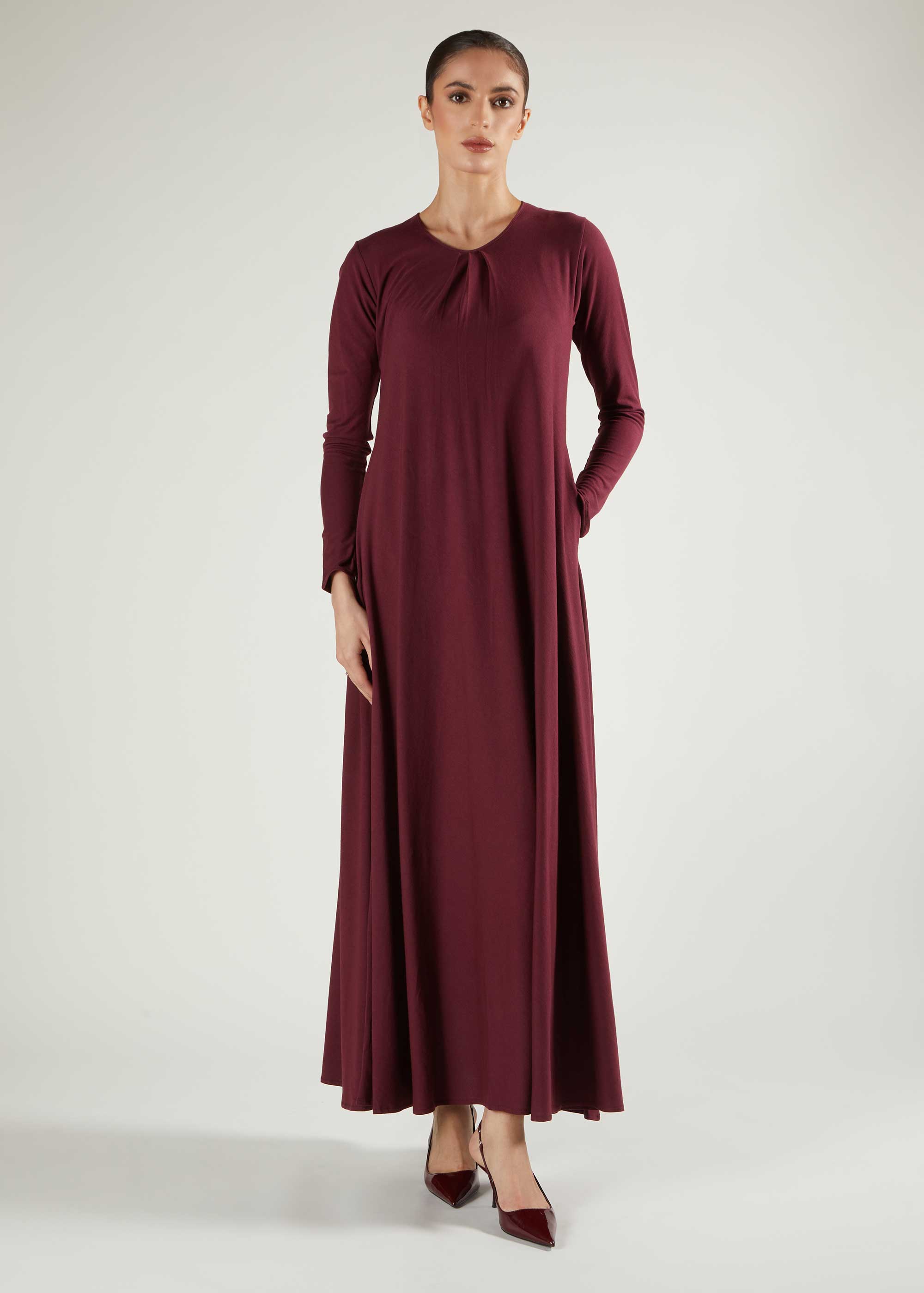 Made from luxurious 100% cotton jersey, this elegant abaya has a semi-fitted bodice and a voluminous drop. The round neckline is accented with subtle pleats, while branded buttons adorn the back and sleeve cuffs for a sophisticated touch.