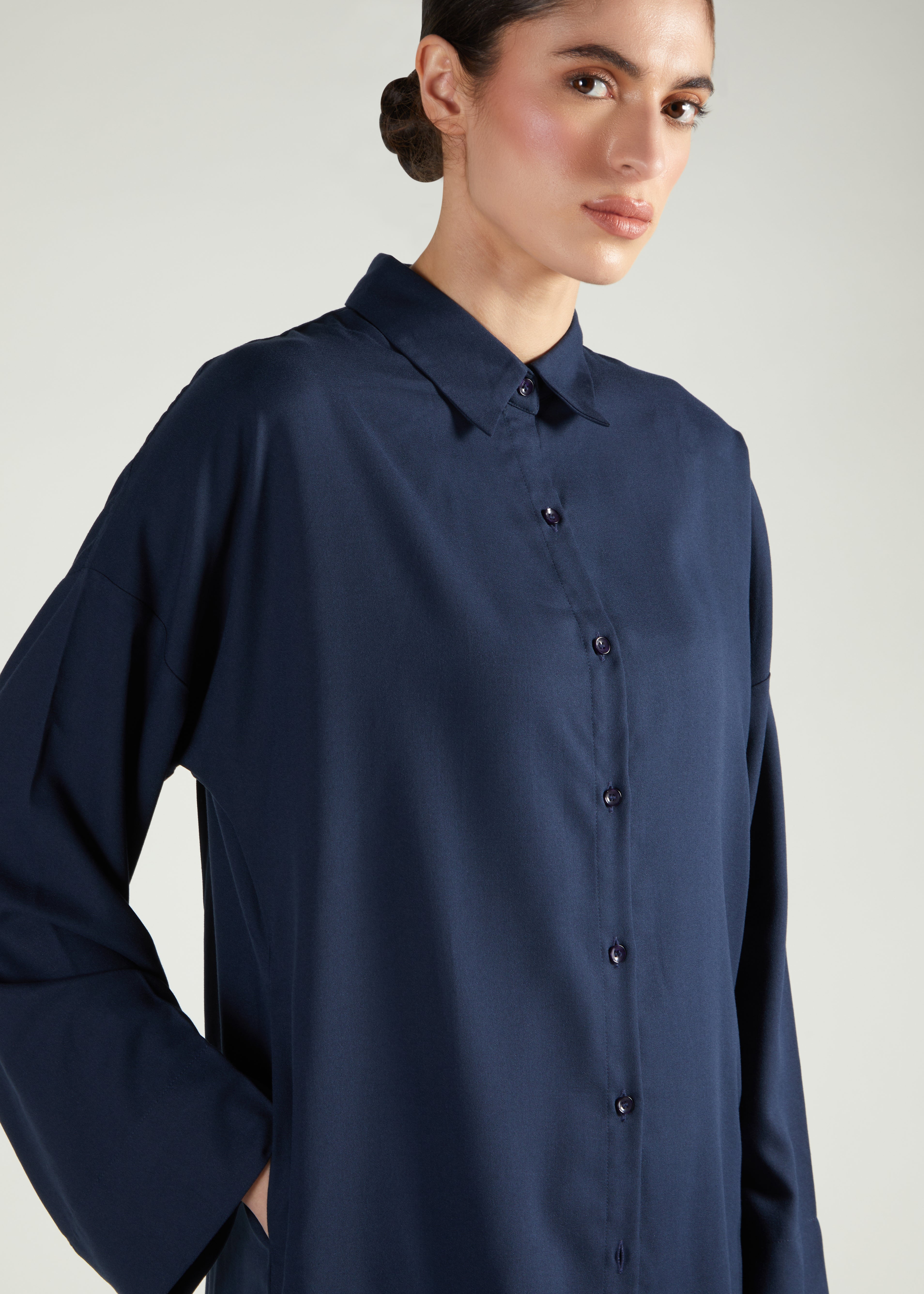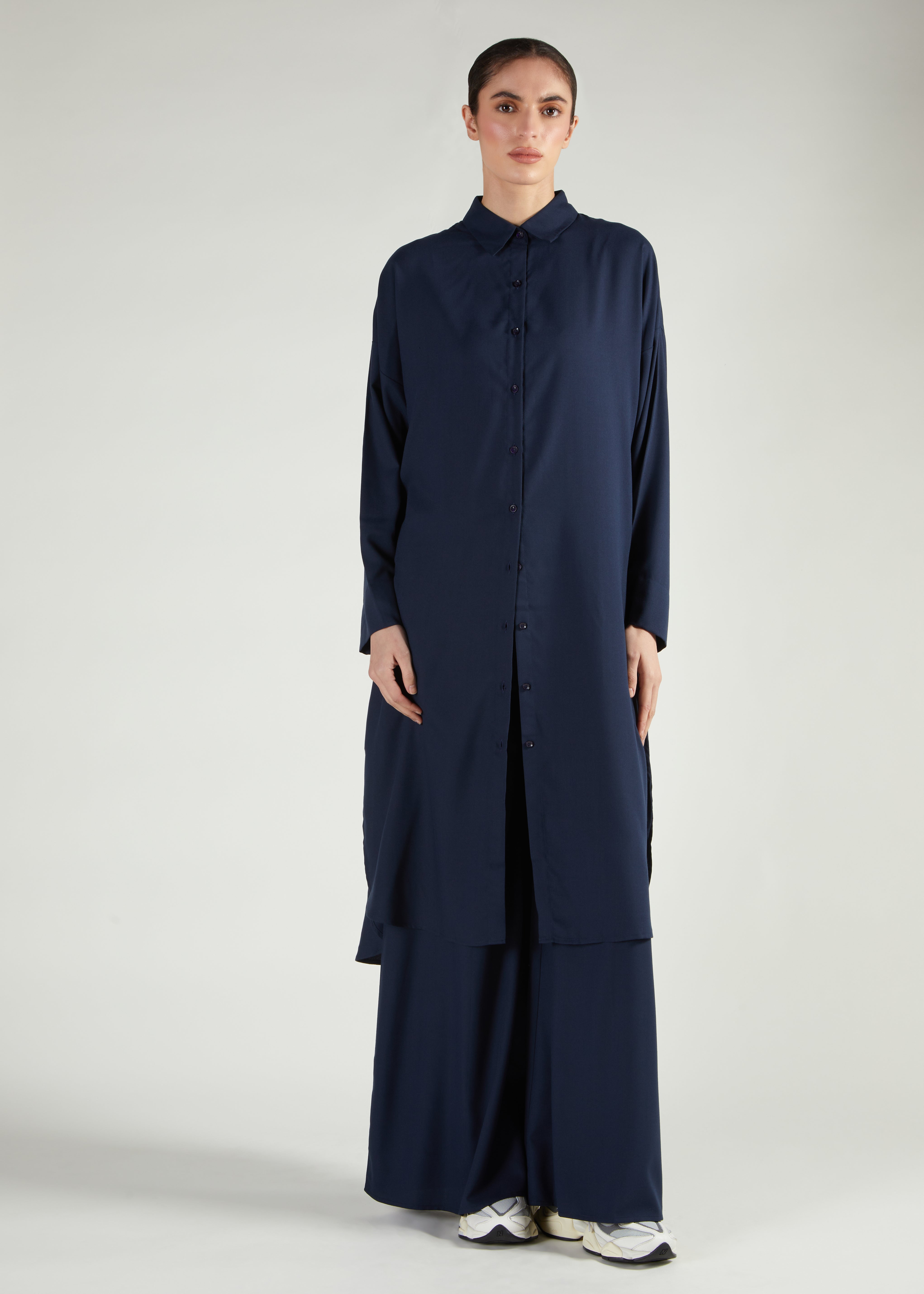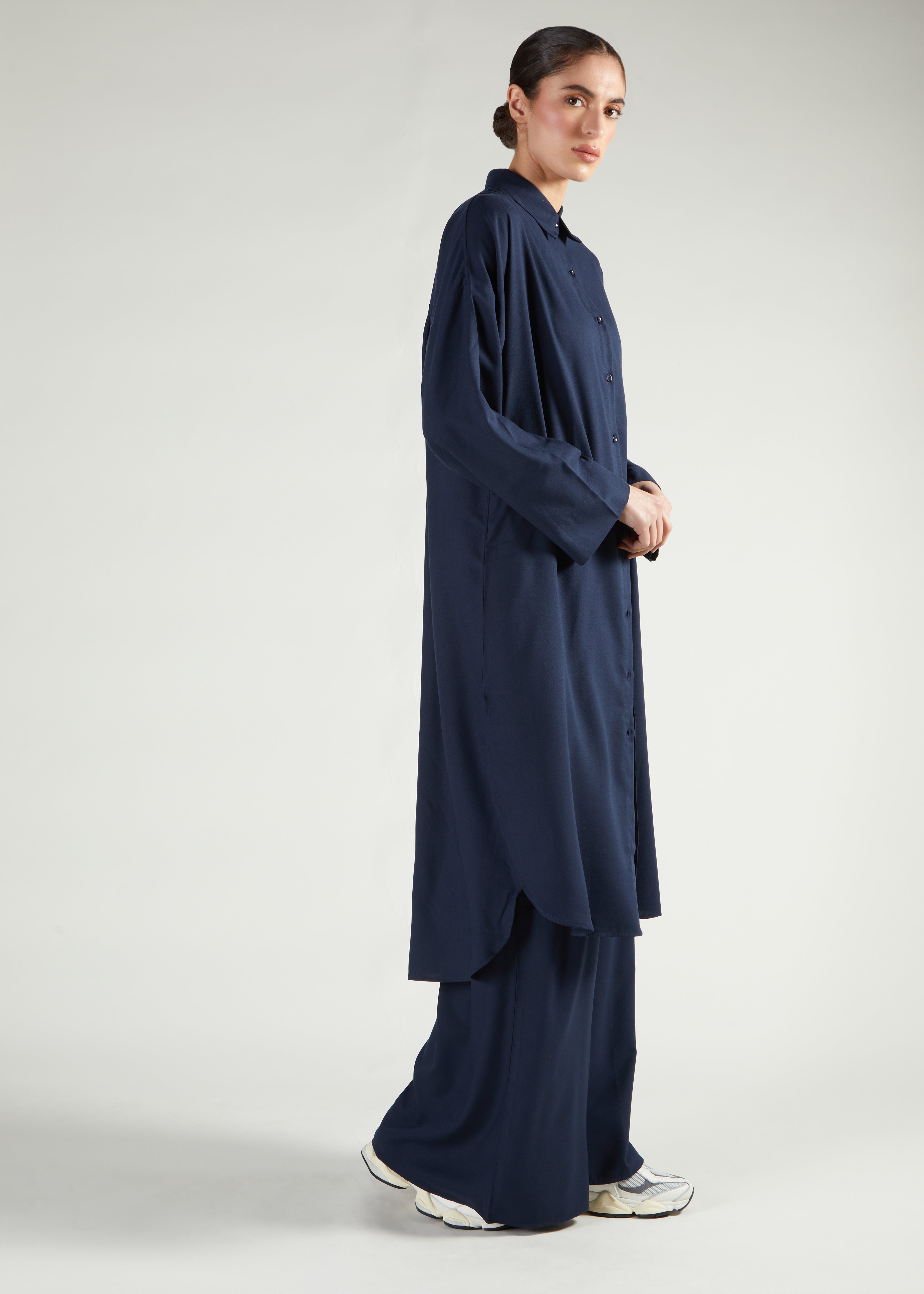 Co-Ord Set features a loose-fitting silhouette and wide cut trousers, complete with discreet side pockets, the loose fit silhouette means you can layer over roll necks this season
