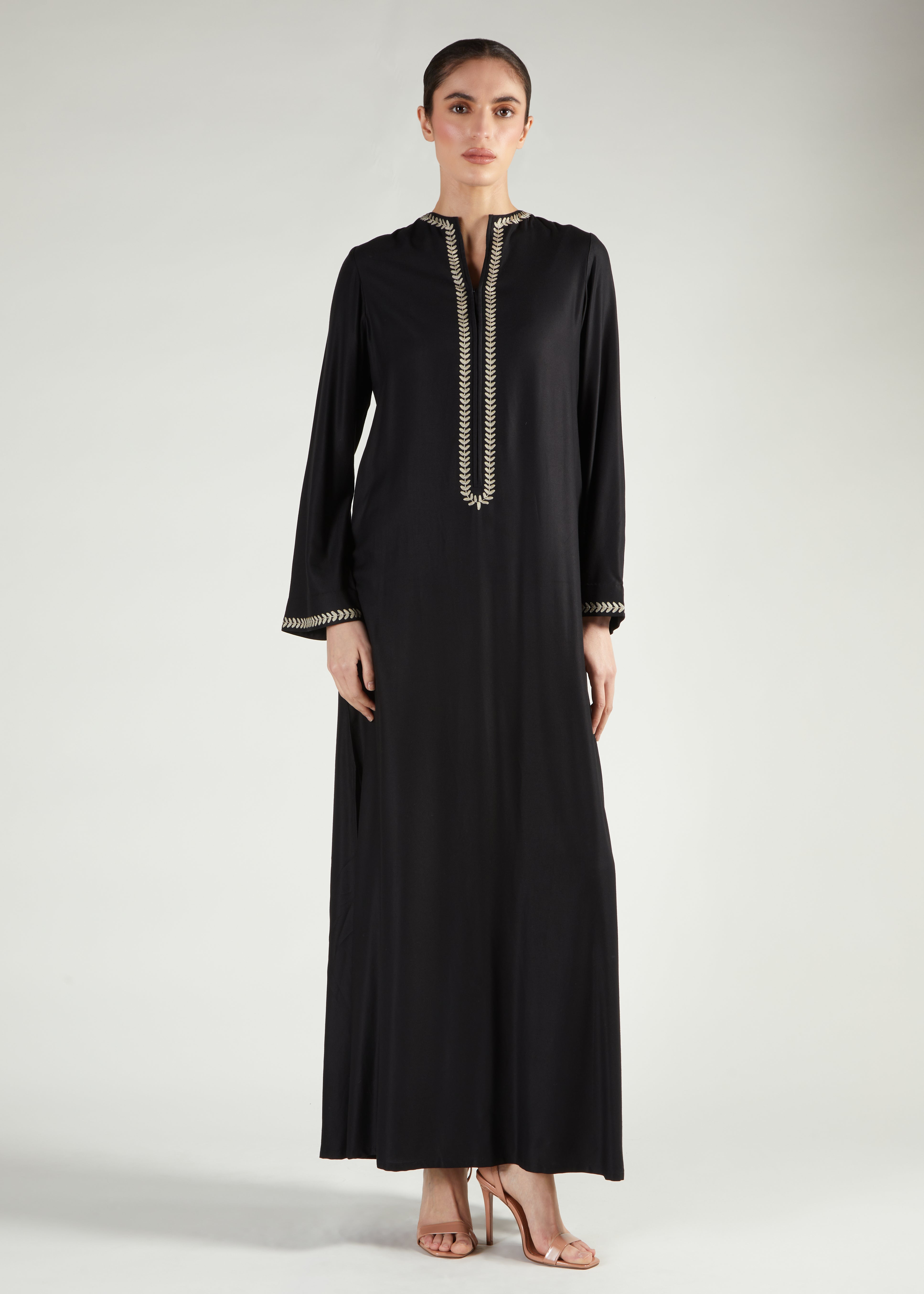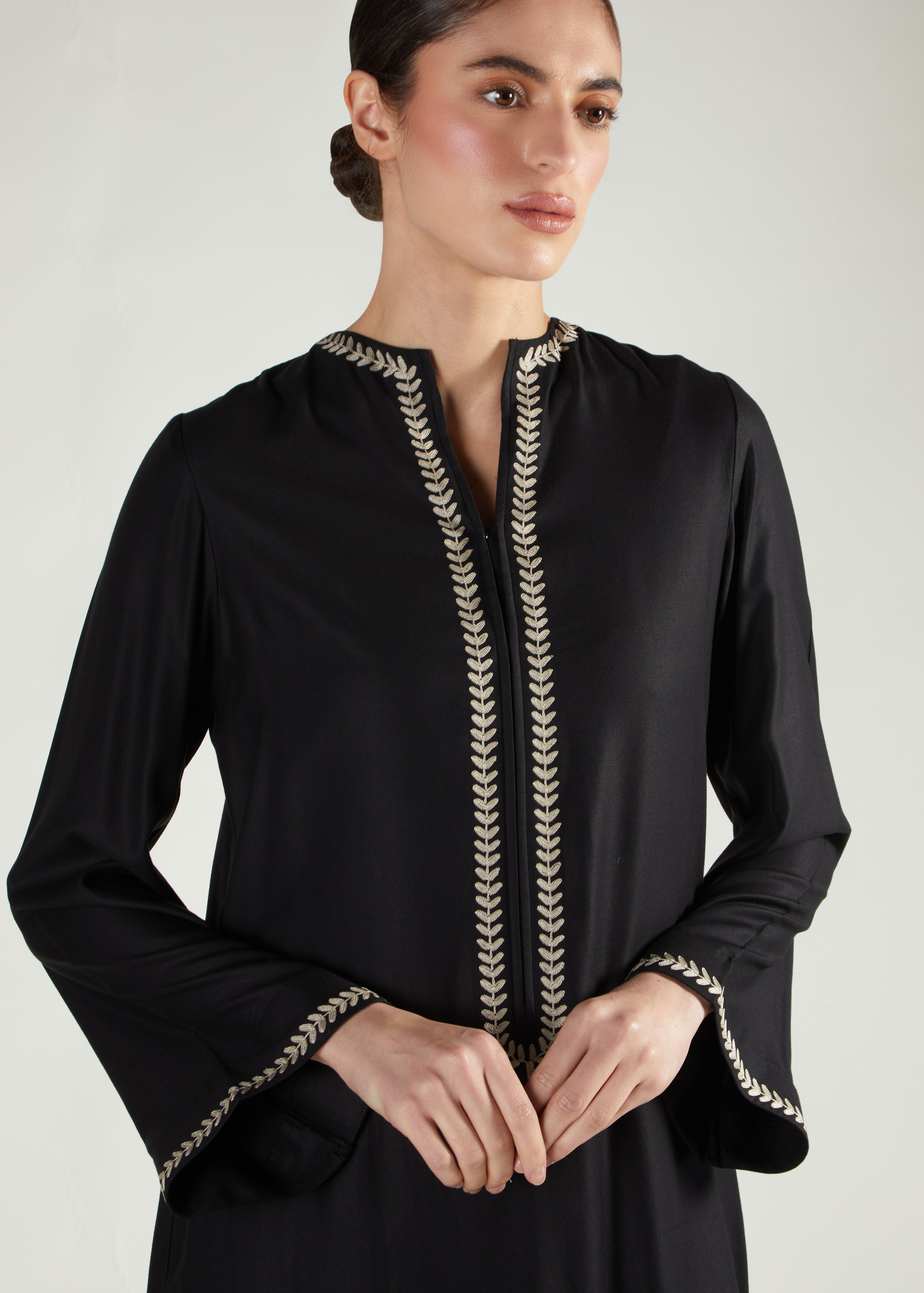 A Classic A-line cut black Abaya which features oak leaf embroidery on the bodice and edge of sleeves. When less is more, Oak Leaf offers a regal look.