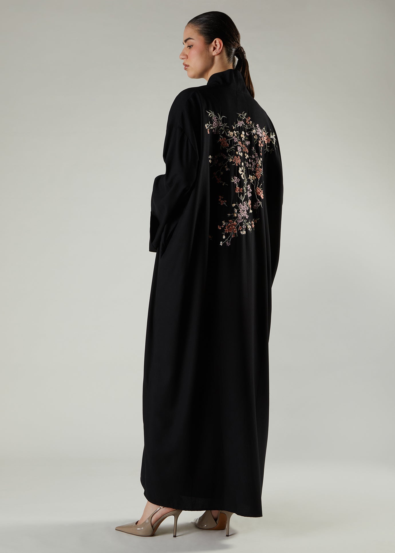 The cut of this garment has been inspired by traditional Japanese kimonos and the beautiful floral motif on the back depicts of an oriental spring garden in full bloom. The embroidery features heavily at the back of the garment with a small trail on the front. Pair with our range of light-coloured slips to elevate the outfit and finish your look with our chiffon silk hijabs.