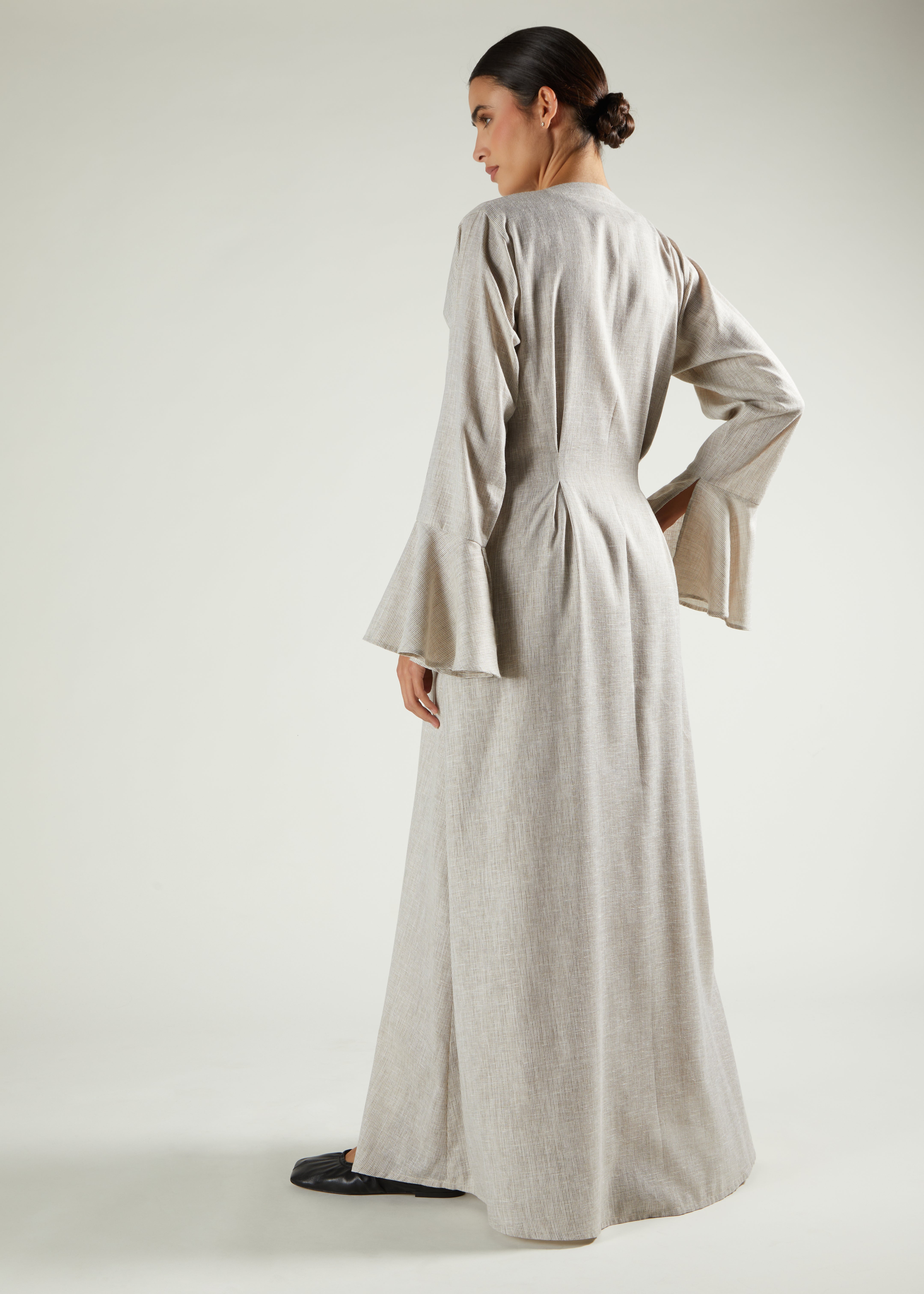 A contemporary take on timeless elegance, this garment is beautifully tailored to create a refined and effortless silhouette. Made from a soft, lightly textured fabric, it features subtle pleat detailing through the front and back that adds gentle structure and movement. The flared sleeves introduce a touch of modern femininity, while concealed fastening and side pockets provide a seamless finish. Understated yet sophisticated, this piece transitions effortlessly from day to evening.
