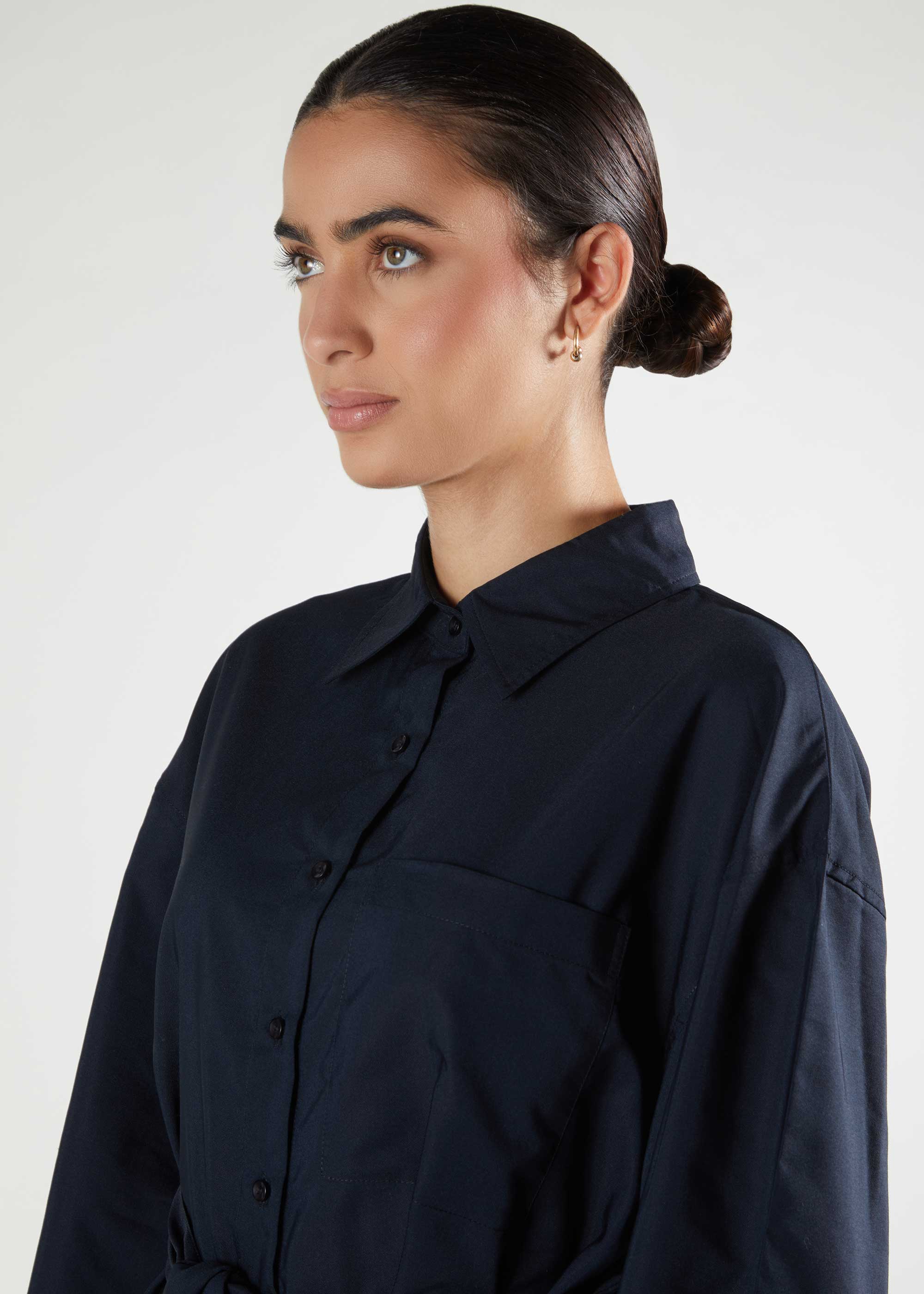 The Maxi features an oversized silhouette, adopting our timeless shirt-cut design now tailored for a relaxed fit. Rendered in a deep navy shade, it can be styled with the matching fabric belt or personalised with your own. Ideal for layering over knitwear during cooler months, it offers both comfort and versatility.