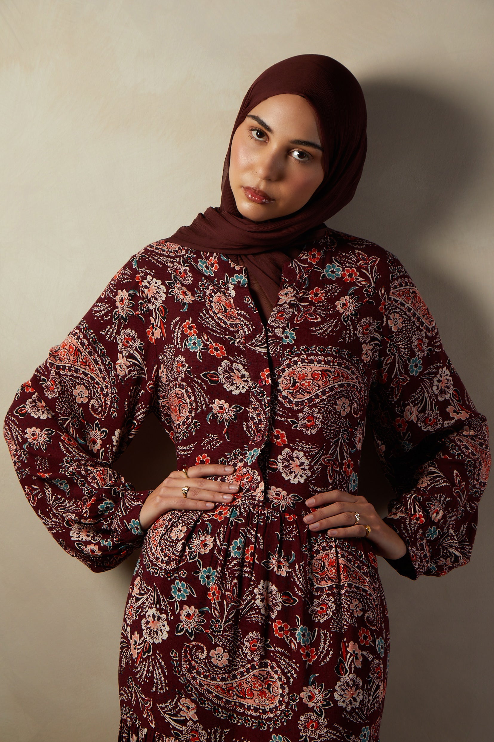 Paisley Maxi features an A line silhouette with a small v neck design, made from a warm woven jute cotton fabric with a classic paisley print, the maxi has a detachable belt and features discreet side pockets