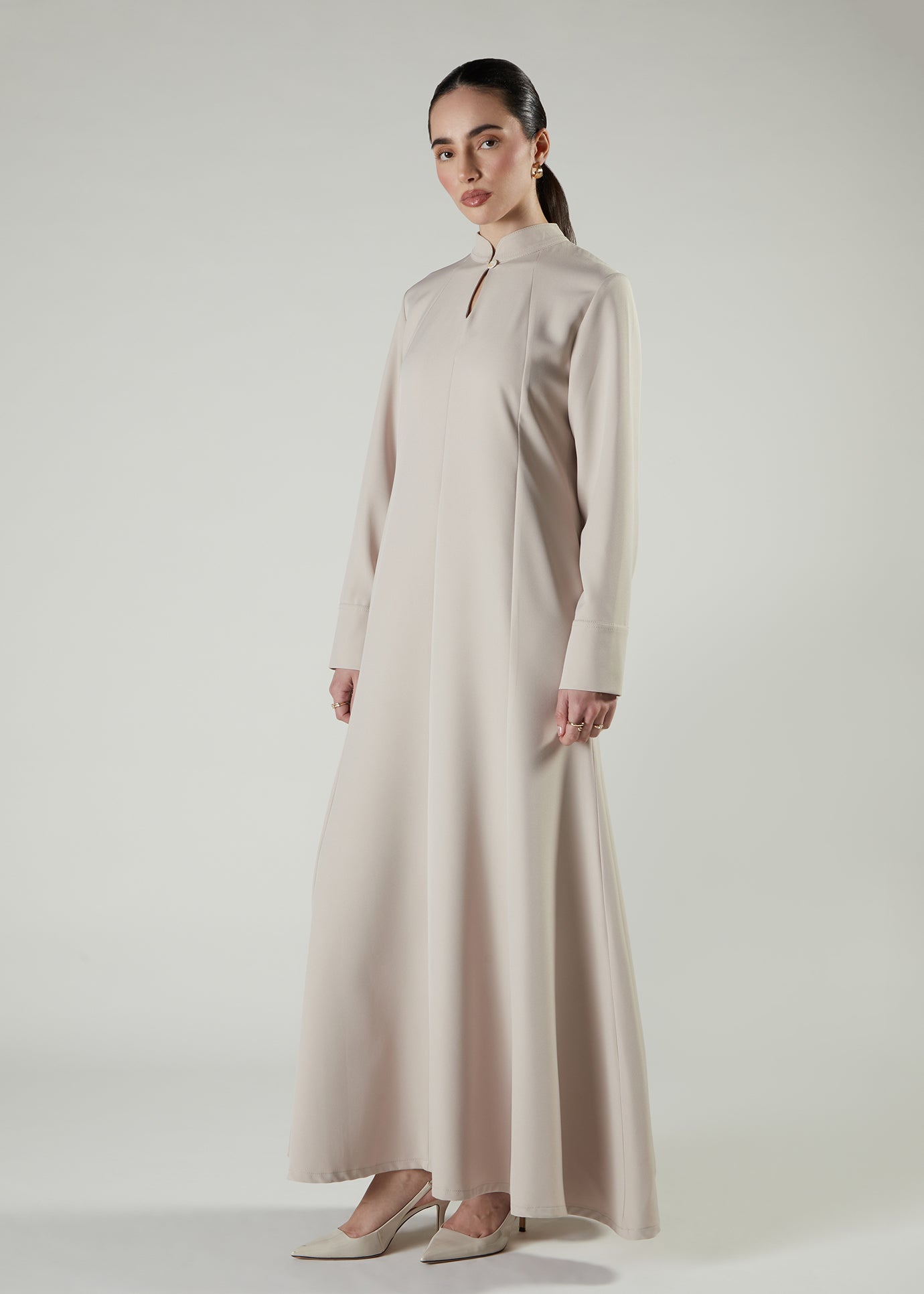 A fit and flare style abaya cut in panels to give a structured but elegant look.