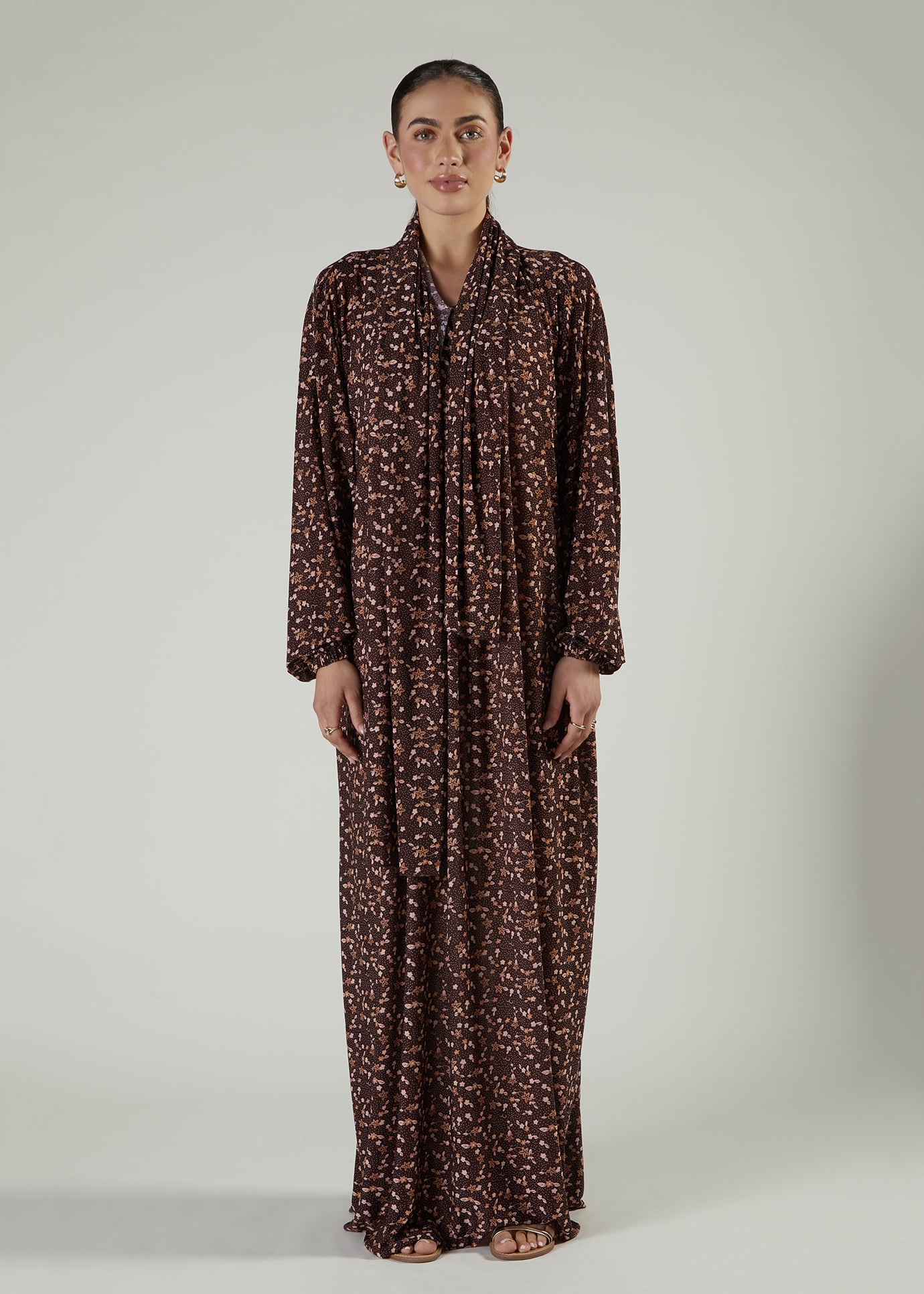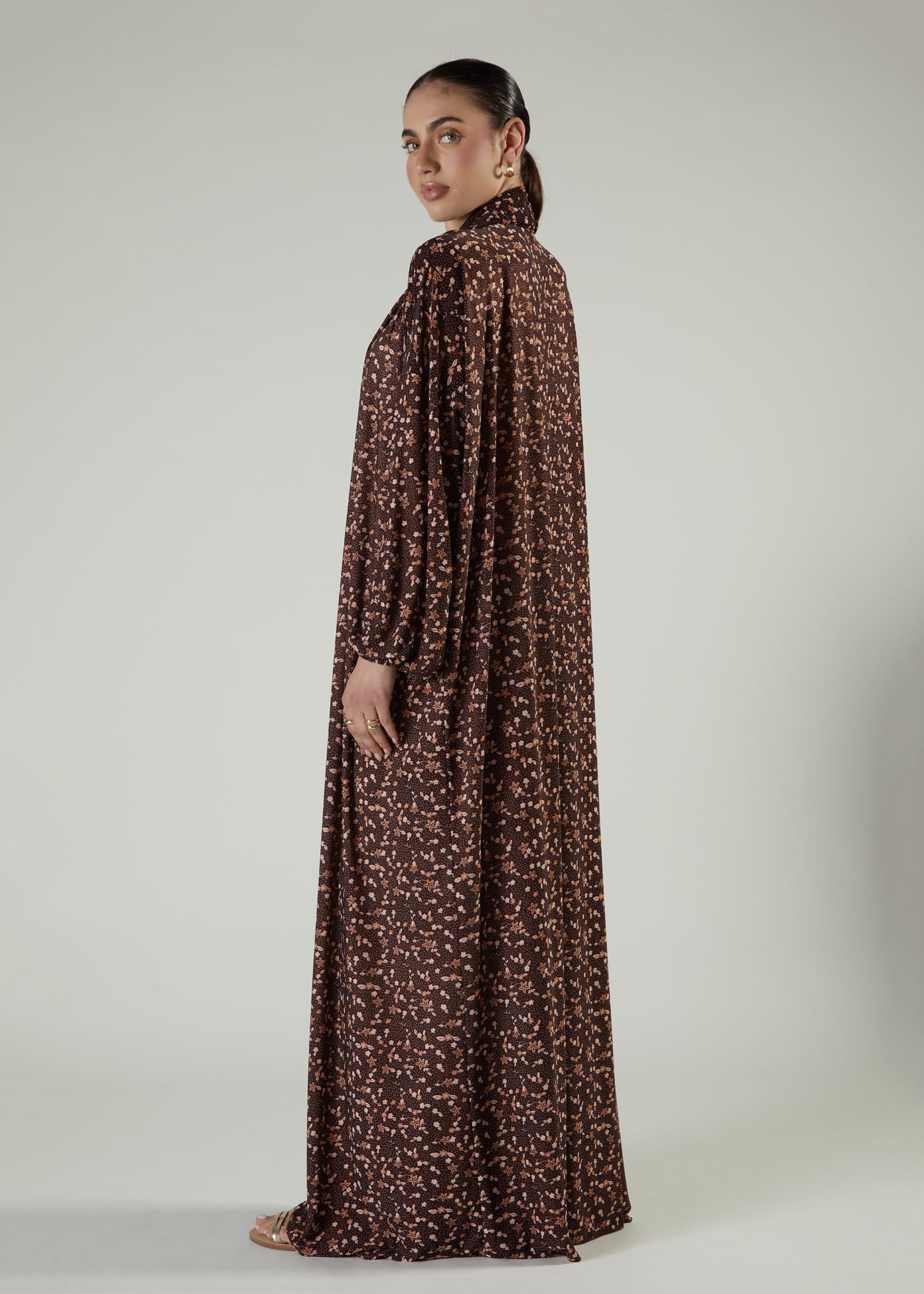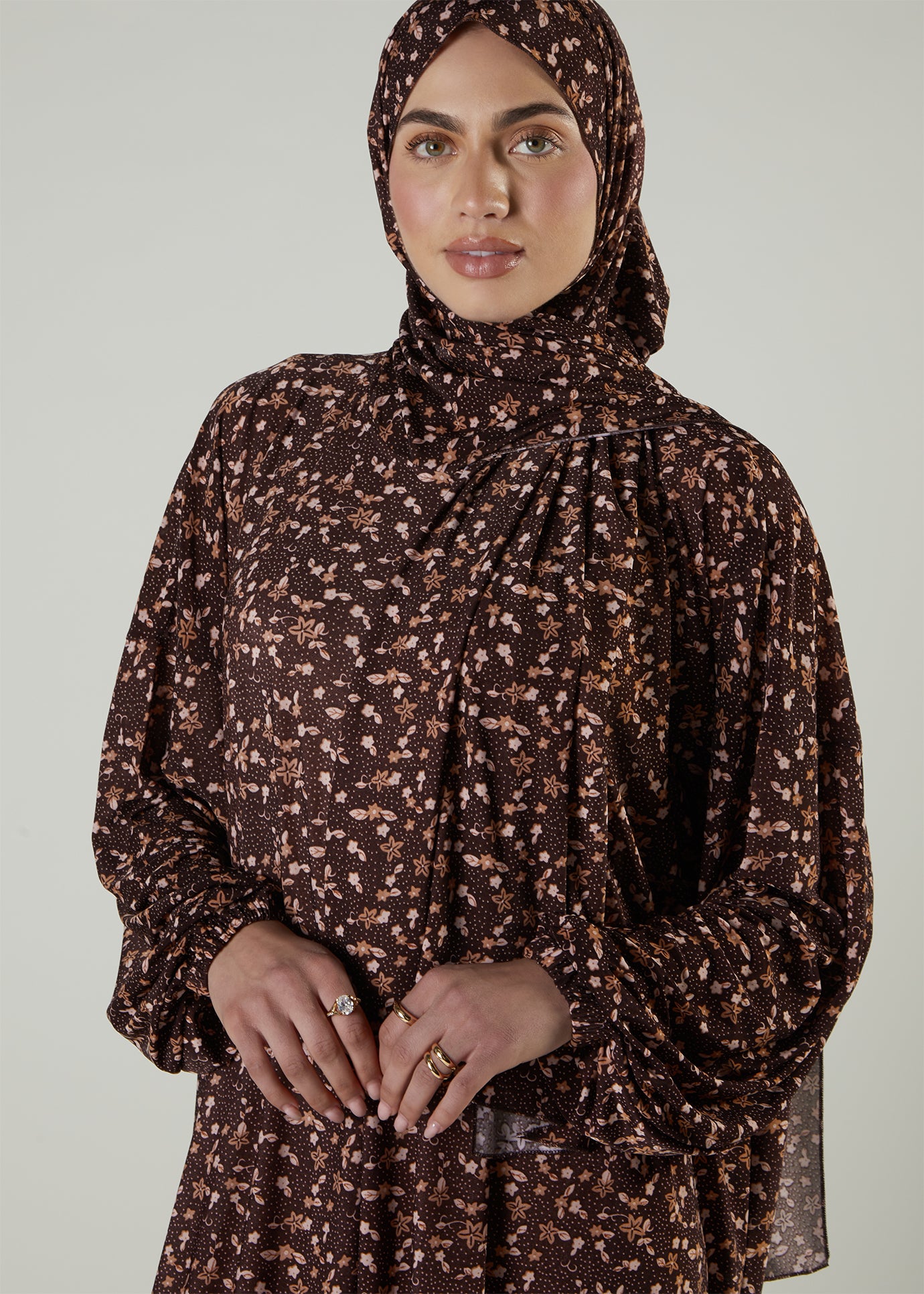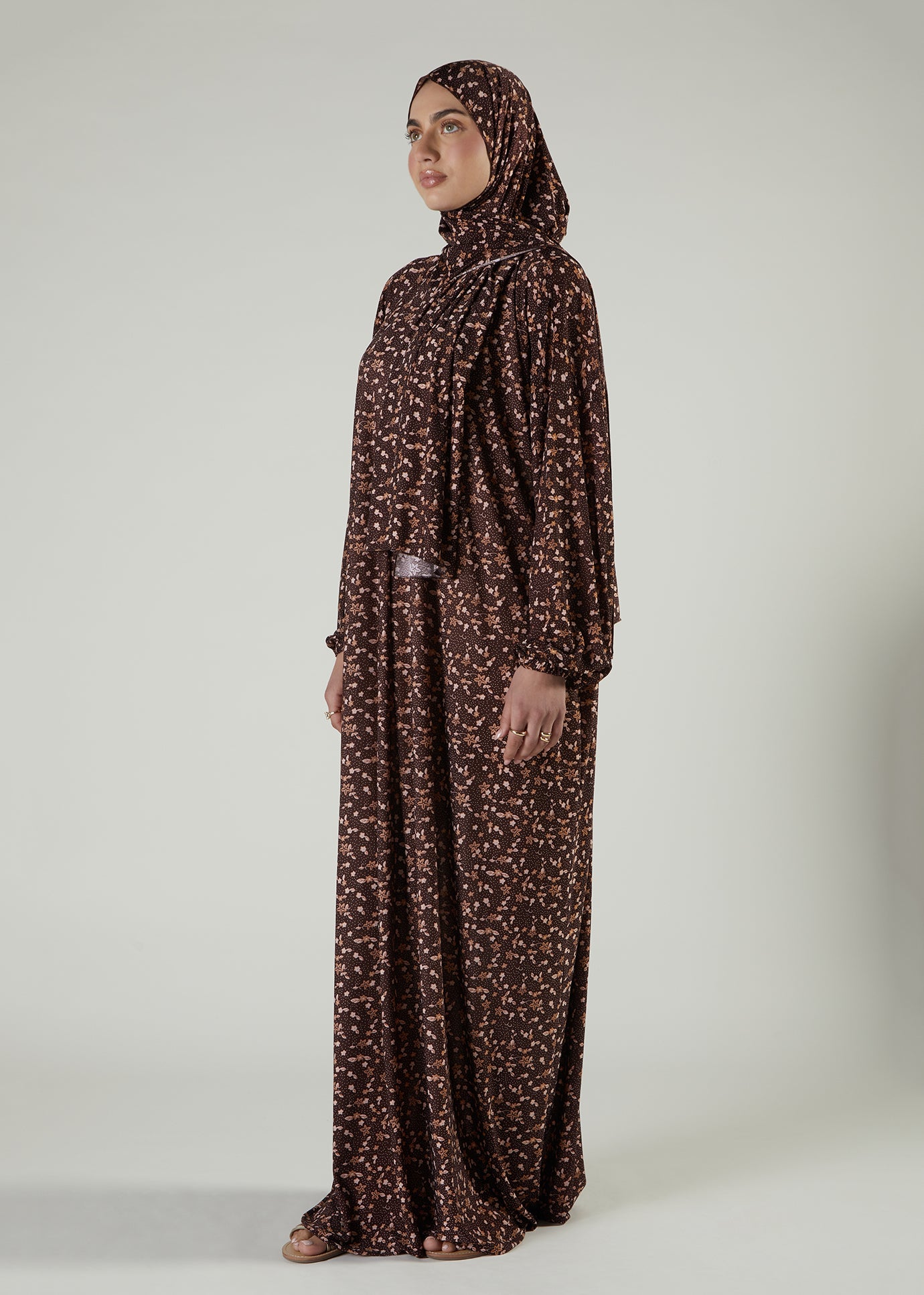 Ramadan ready prayer outfit, it features a loose silhouette with an attached scarf for ease.