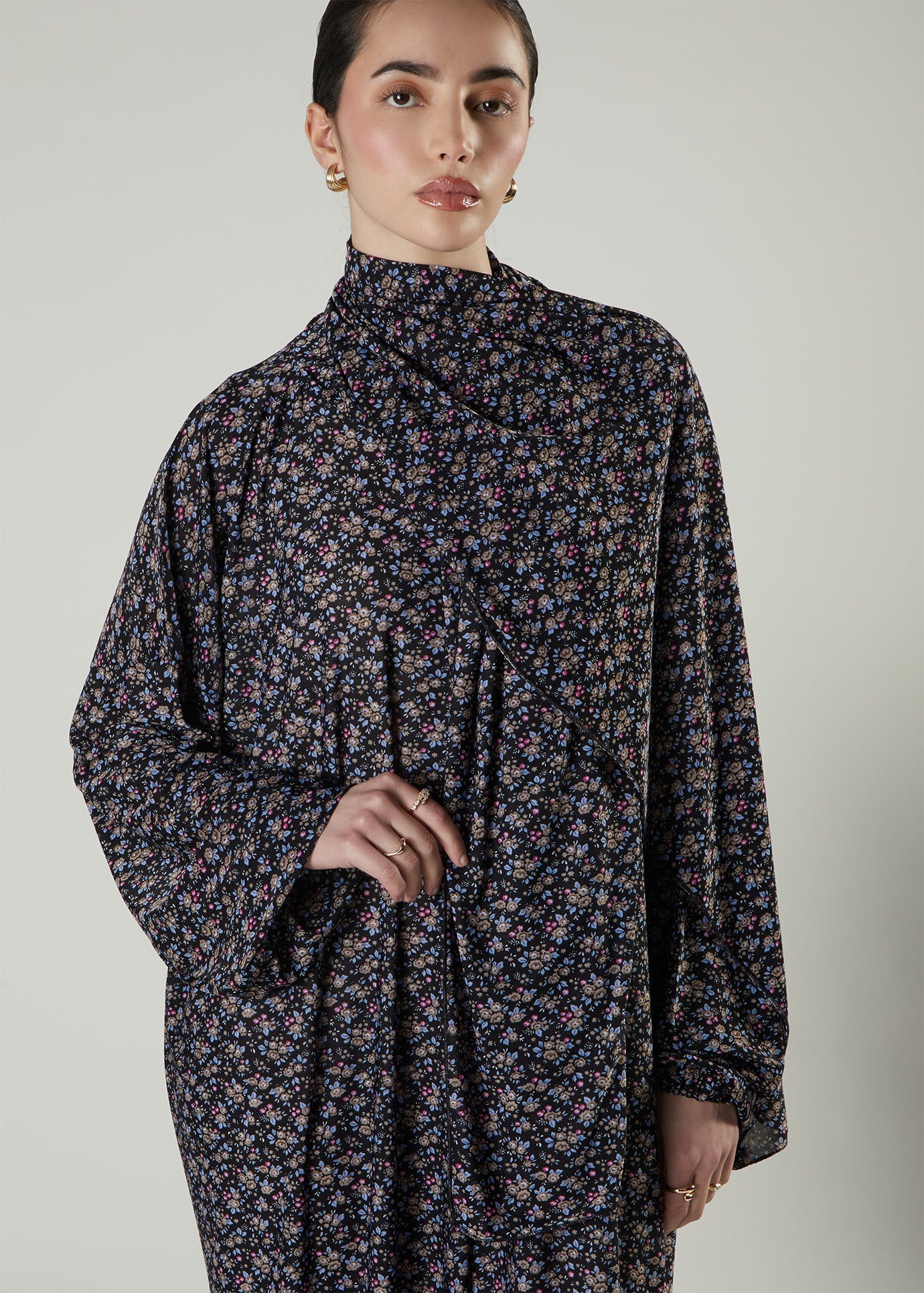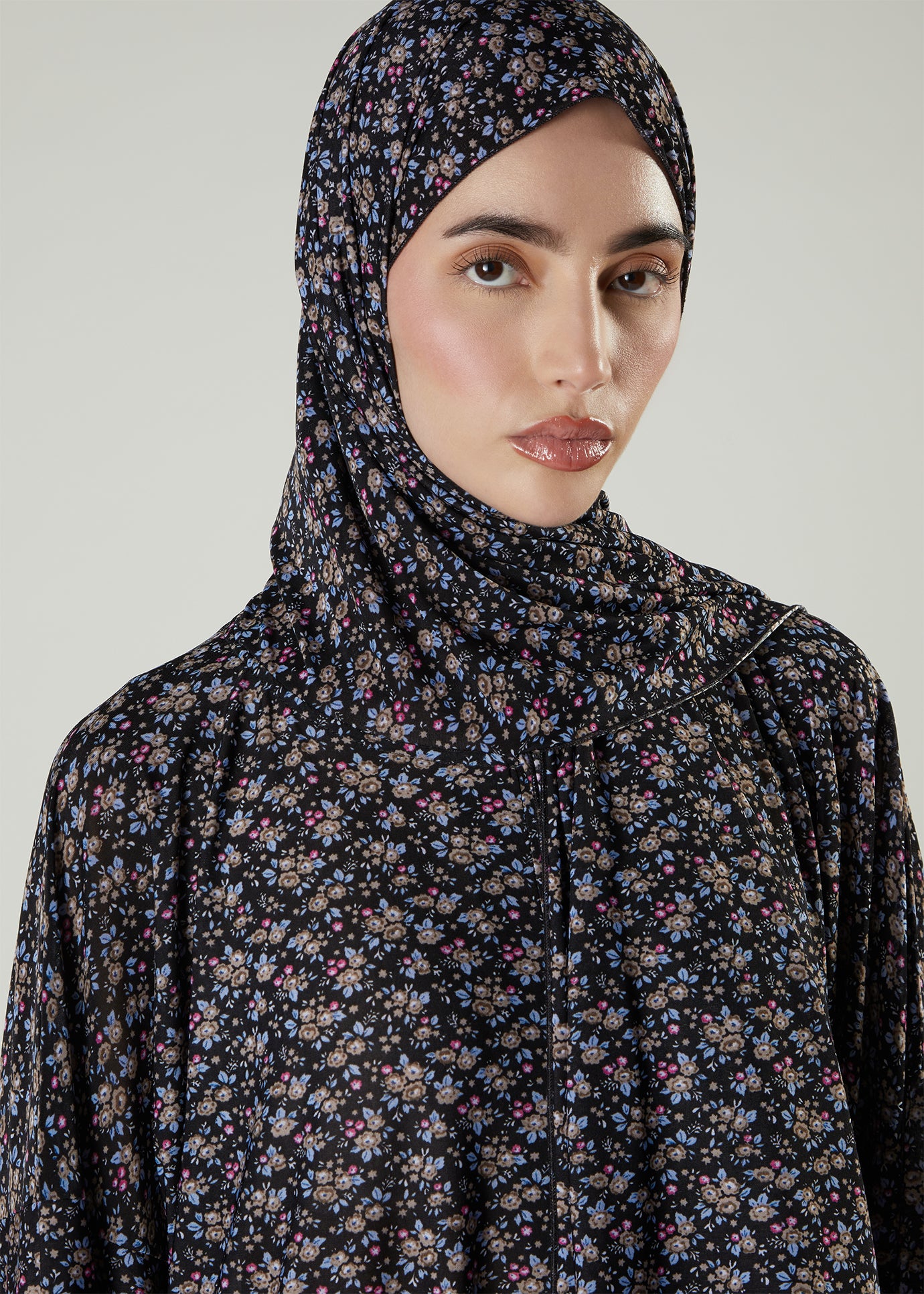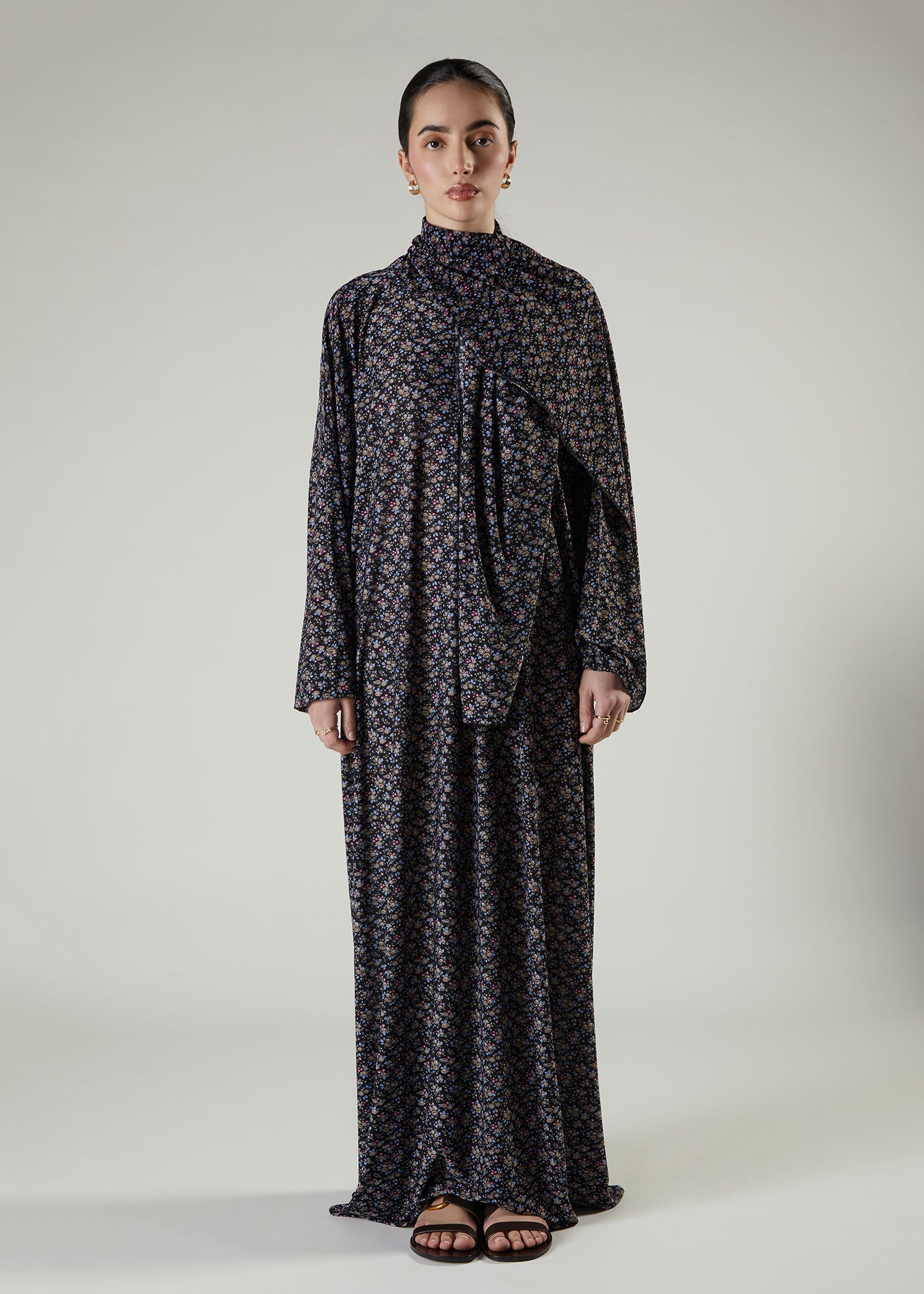 Ramadan ready prayer outfit, it features a loose silhouette with an attached scarf for ease.
