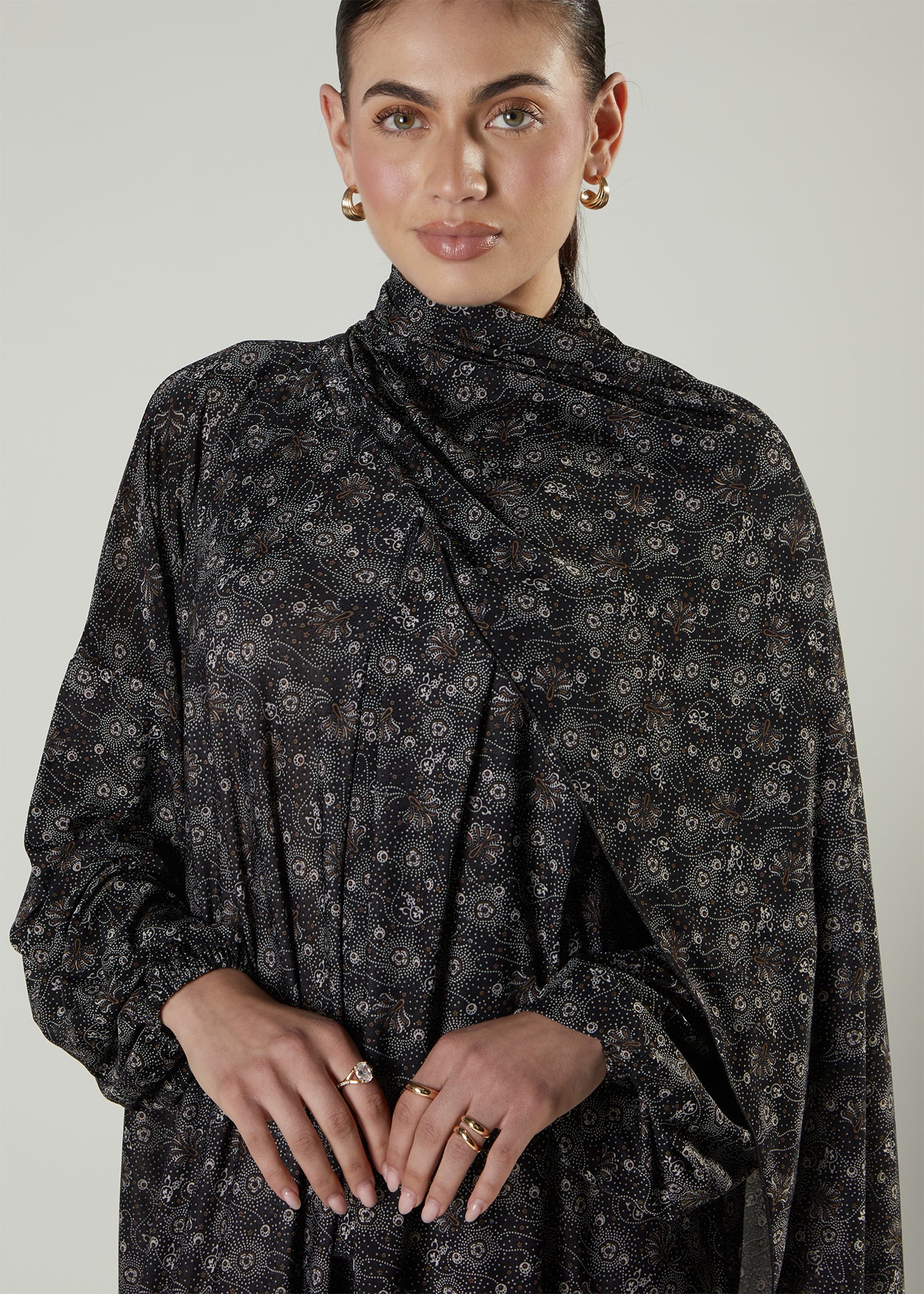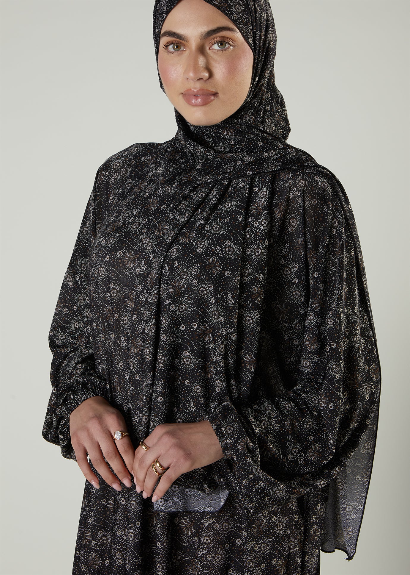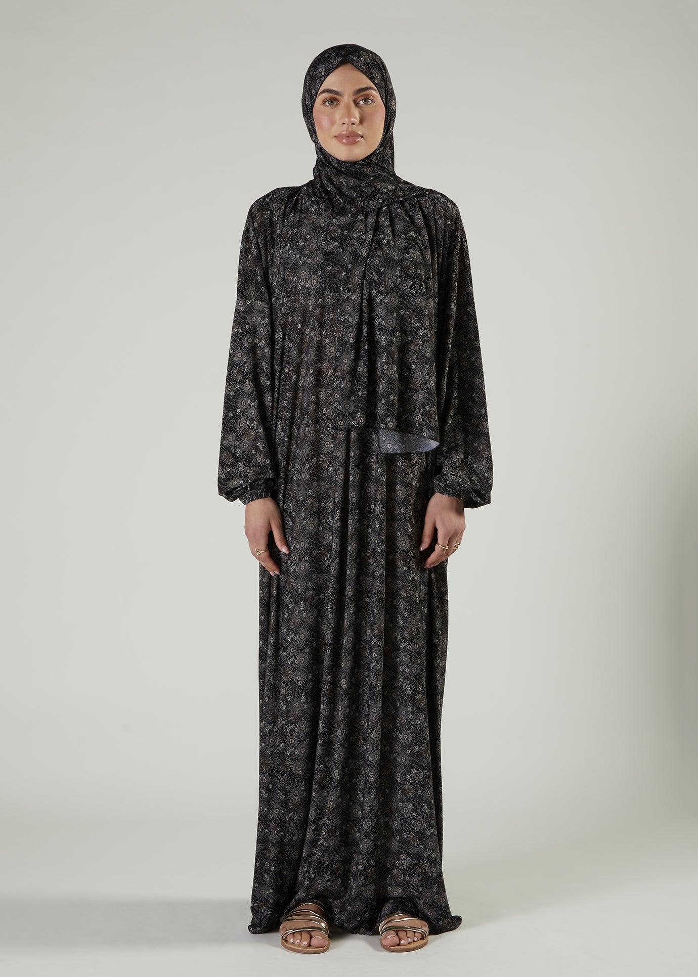 Ramadan ready prayer outfit, it features a loose silhouette with an attached scarf for ease.