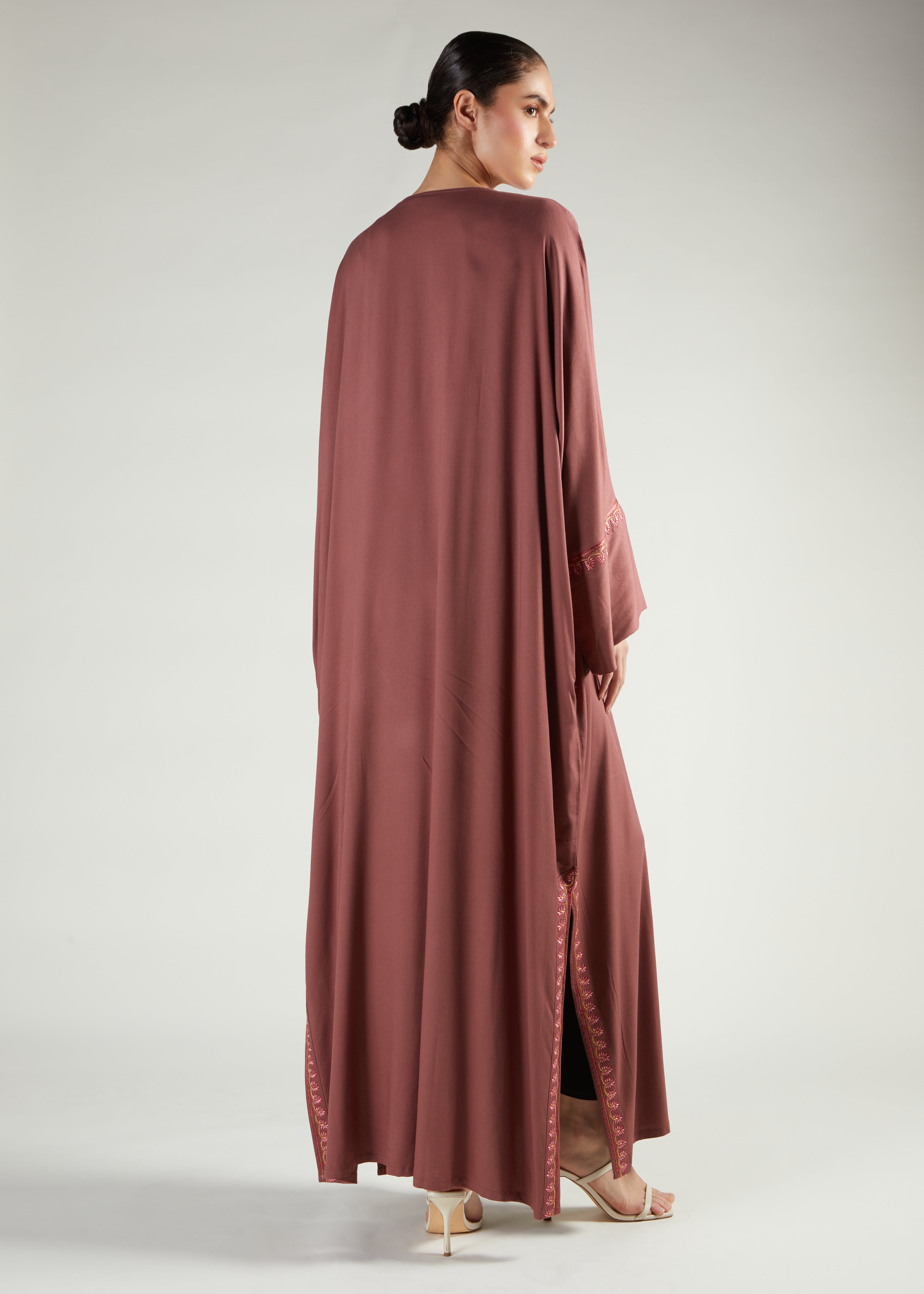 This Kaftan features pretty pink embroidery on this vintage rose twill fabric, the embroidery is on the bodice, cuffs as well as the mini side slits and outlining the pocket area. Comfortable, stylish and perfect for occasions.