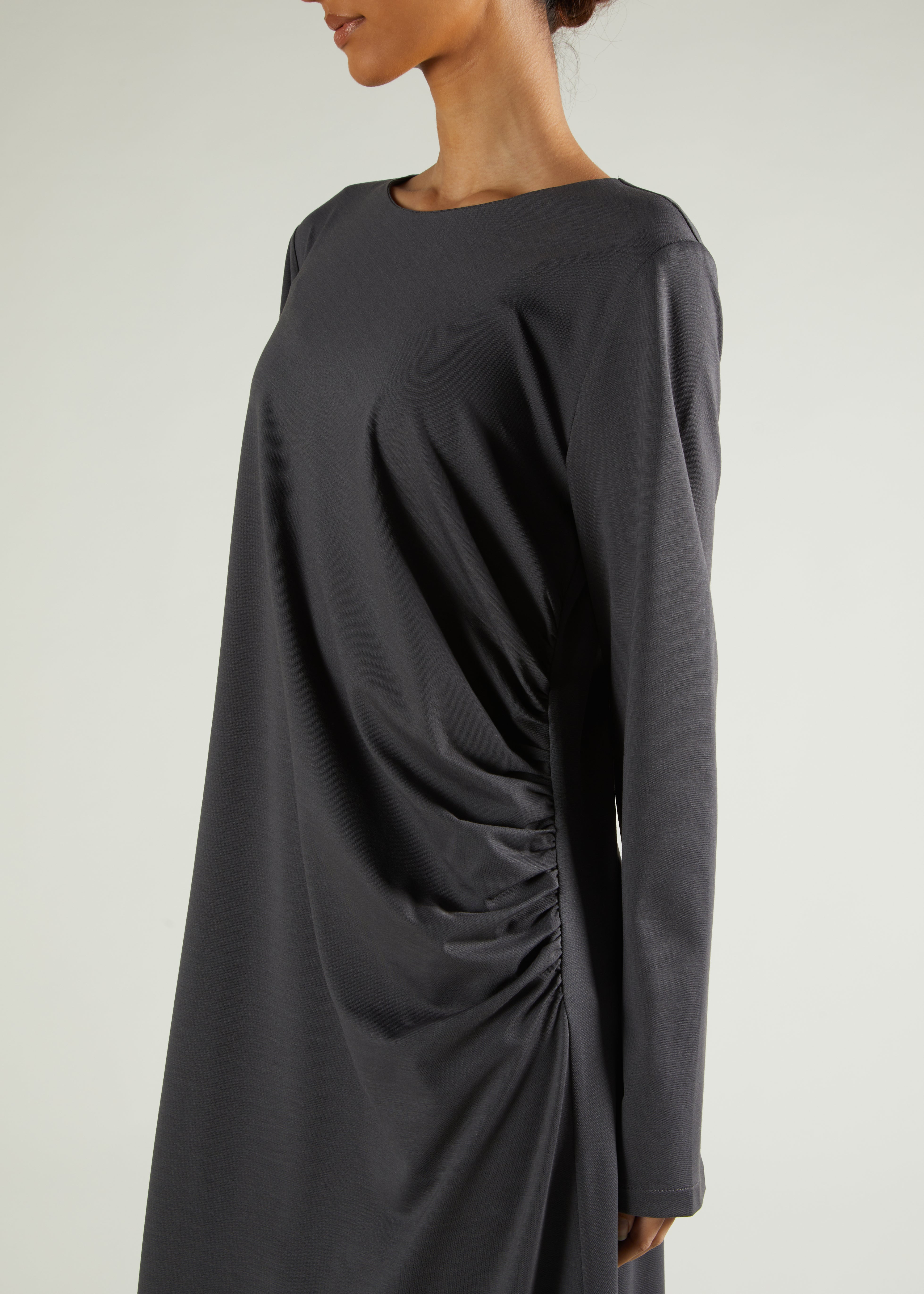 This abaya is designed for effortless style. Made from stretchy jersey fabric with a subtle side pleat, it's comfortable enough for everyday wear yet polished enough for evening occasions. The simple round neckline keeps things classic, and the hidden back zip makes it easy for access.