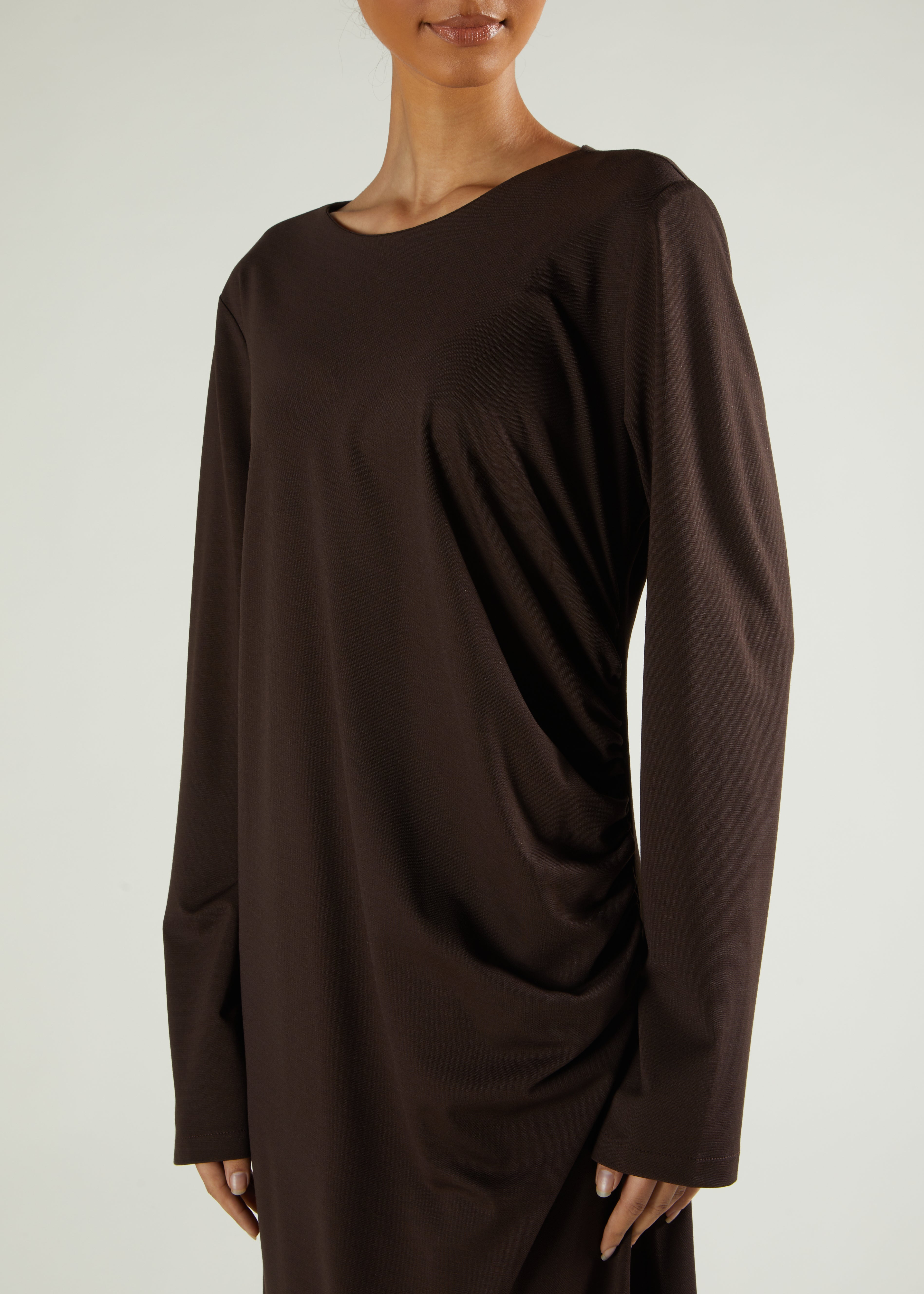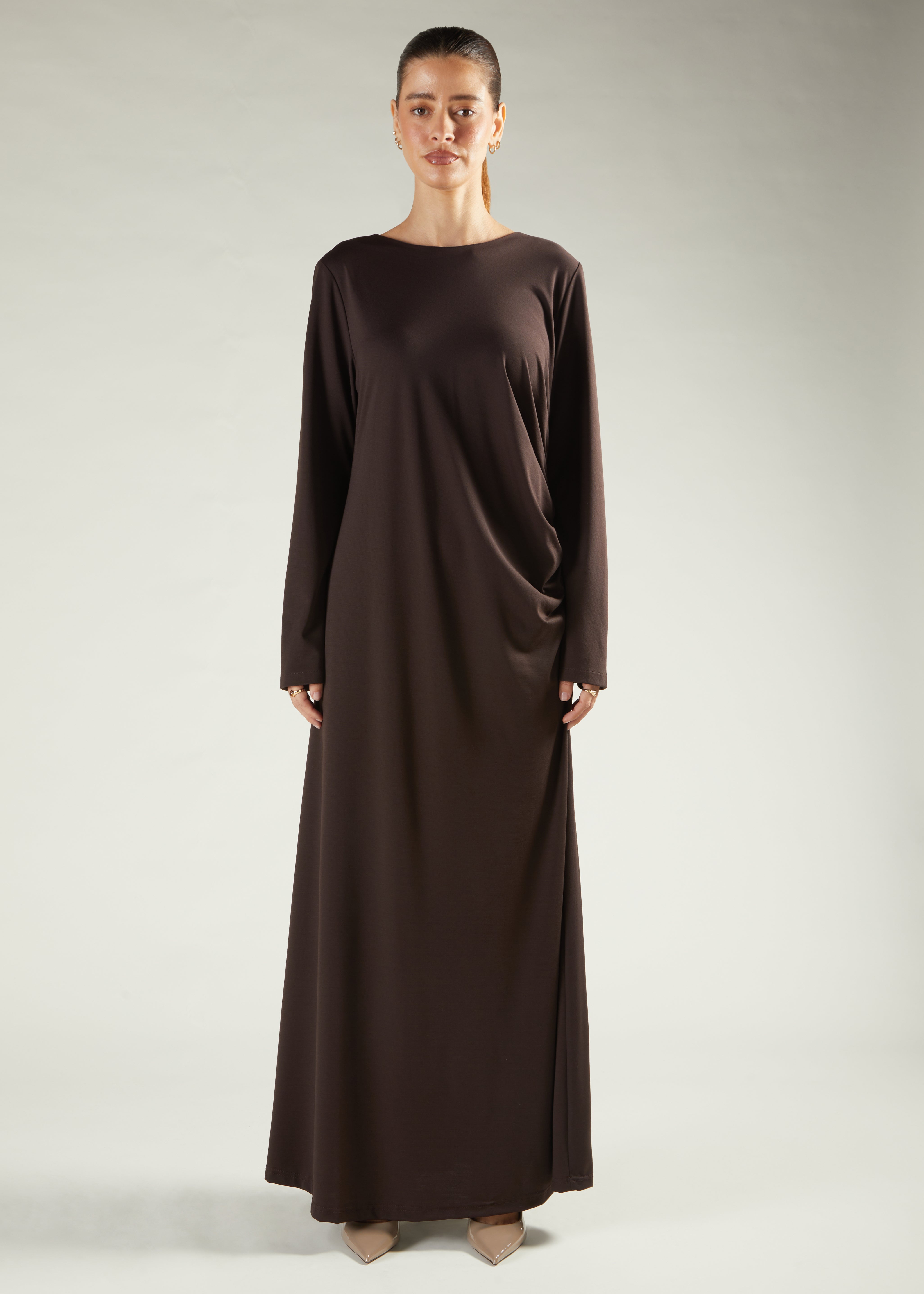 This abaya is designed for effortless style. Made from stretchy jersey fabric with a subtle side pleat, it's comfortable enough for everyday wear yet polished enough for evening occasions. The simple round neckline keeps things classic, and the hidden back zip makes it easy for access.