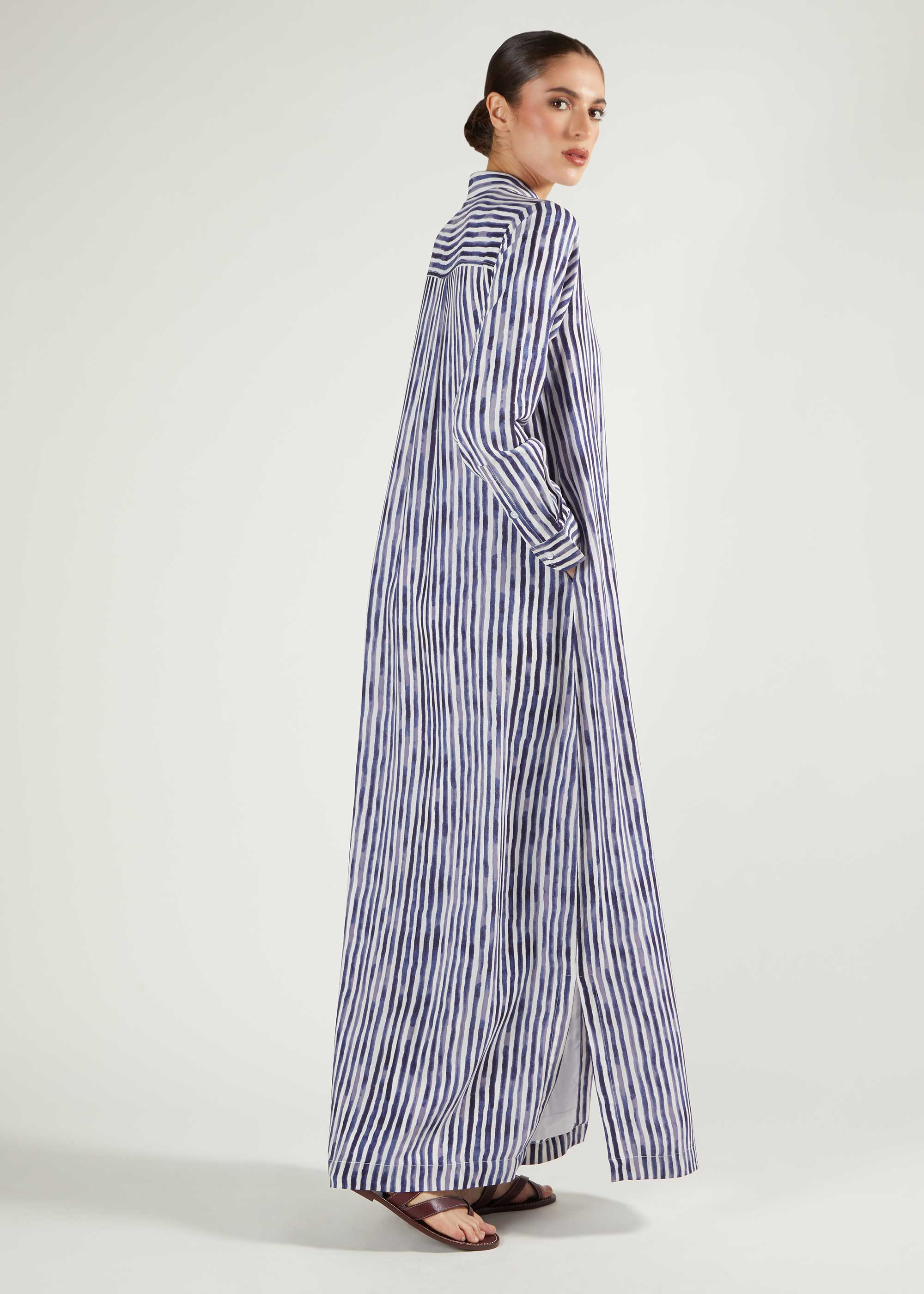 The long-style maxi shirt has a classic nautical stripe design, making it ideal for both professional settings and holiday wardrobes. It includes traditional collars, cuffed sleeves, subtle side pockets, and short side slits for added comfort and style.