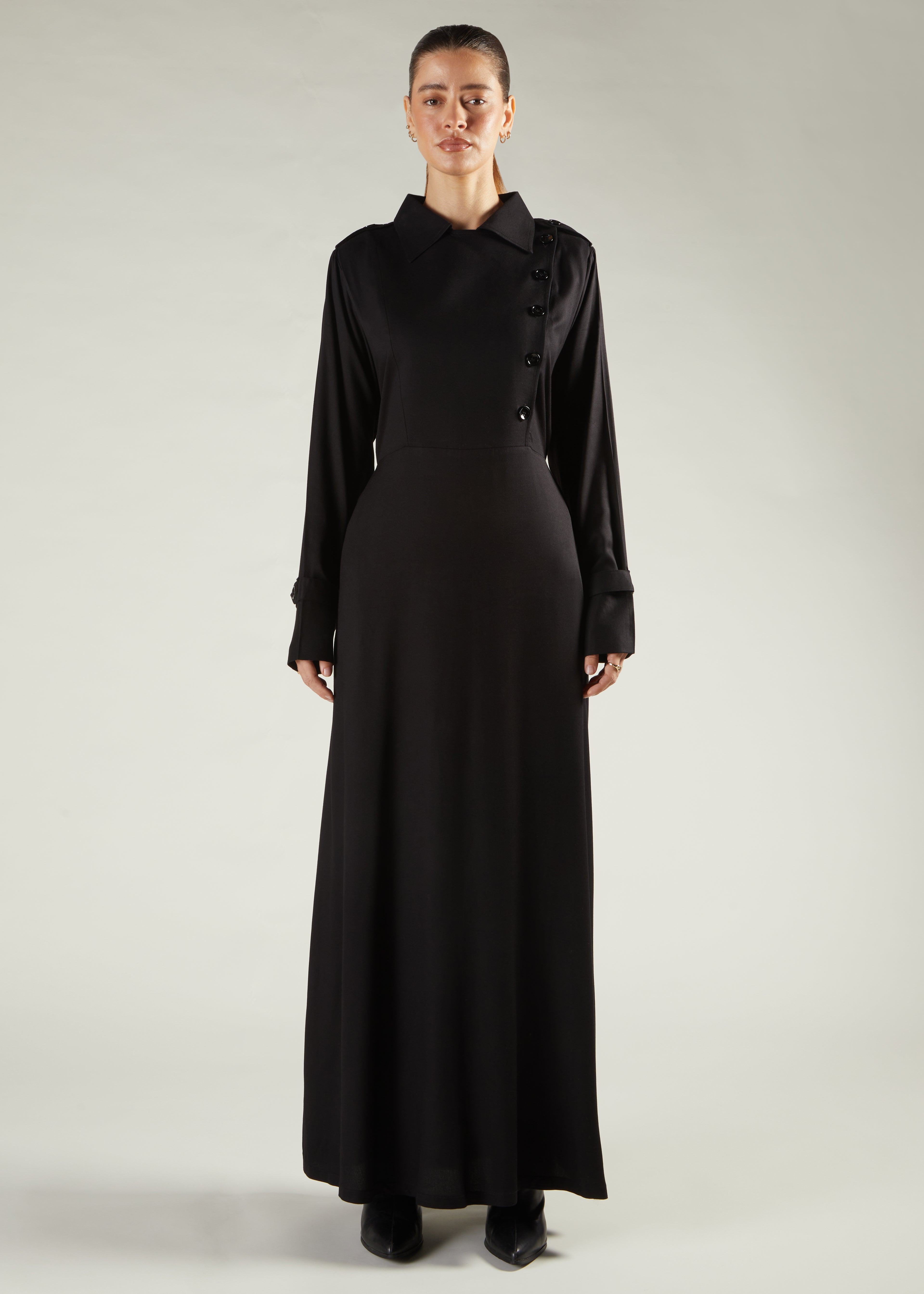 A chic black abaya made with precision tailoring with trench coat-inspired details featuring more width in the lower part. Made from soft twill fabric in a flattering A-line cut, it features button closures on the bodice, belted cuffs, and epaulettes for a polished look.