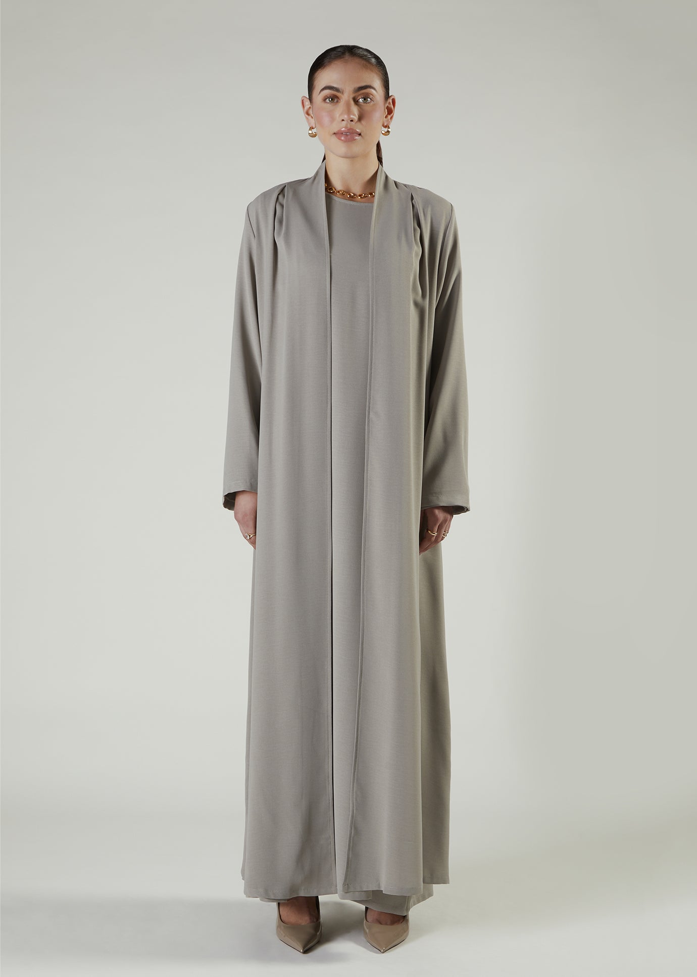 This elegant Two-Piece Open Abaya set includes a Full Sleeve matching slip. Perfect for everyday wear, it can also be dressed up with accessories for an evening look. The full sleeve slip dress can be worn as a maxi dress on its own or paired with the open abaya for a stylish ensemble.