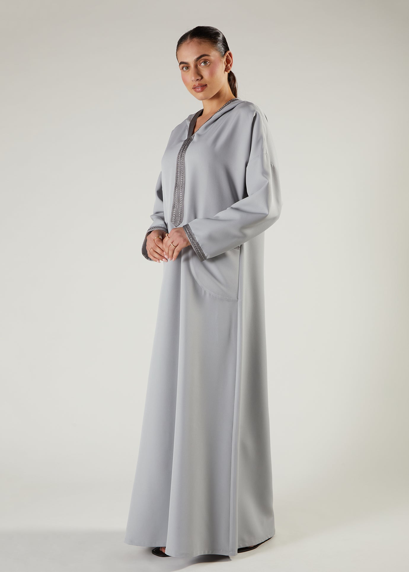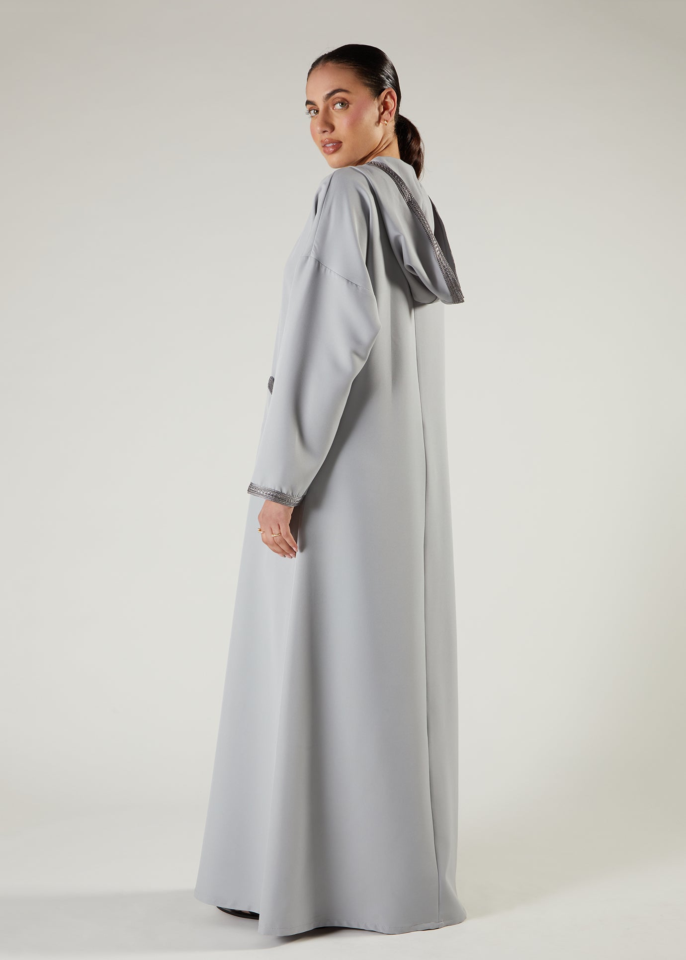 Embrace understated elegance with our Violet Ice Jalabiya, a hooded abaya designed for modern modest fashion. This piece features delicate lace detailing along the neckline and cuffs, adding a touch of refinement without compromising on comfort. The classic A-line silhouette flatters all figures while the practical pockets offer everyday functionality. Perfect for Ramadan gatherings or daily wear, this jalabiya combines timeless style with contemporary details that elevate your wardrobe effortlessly.
