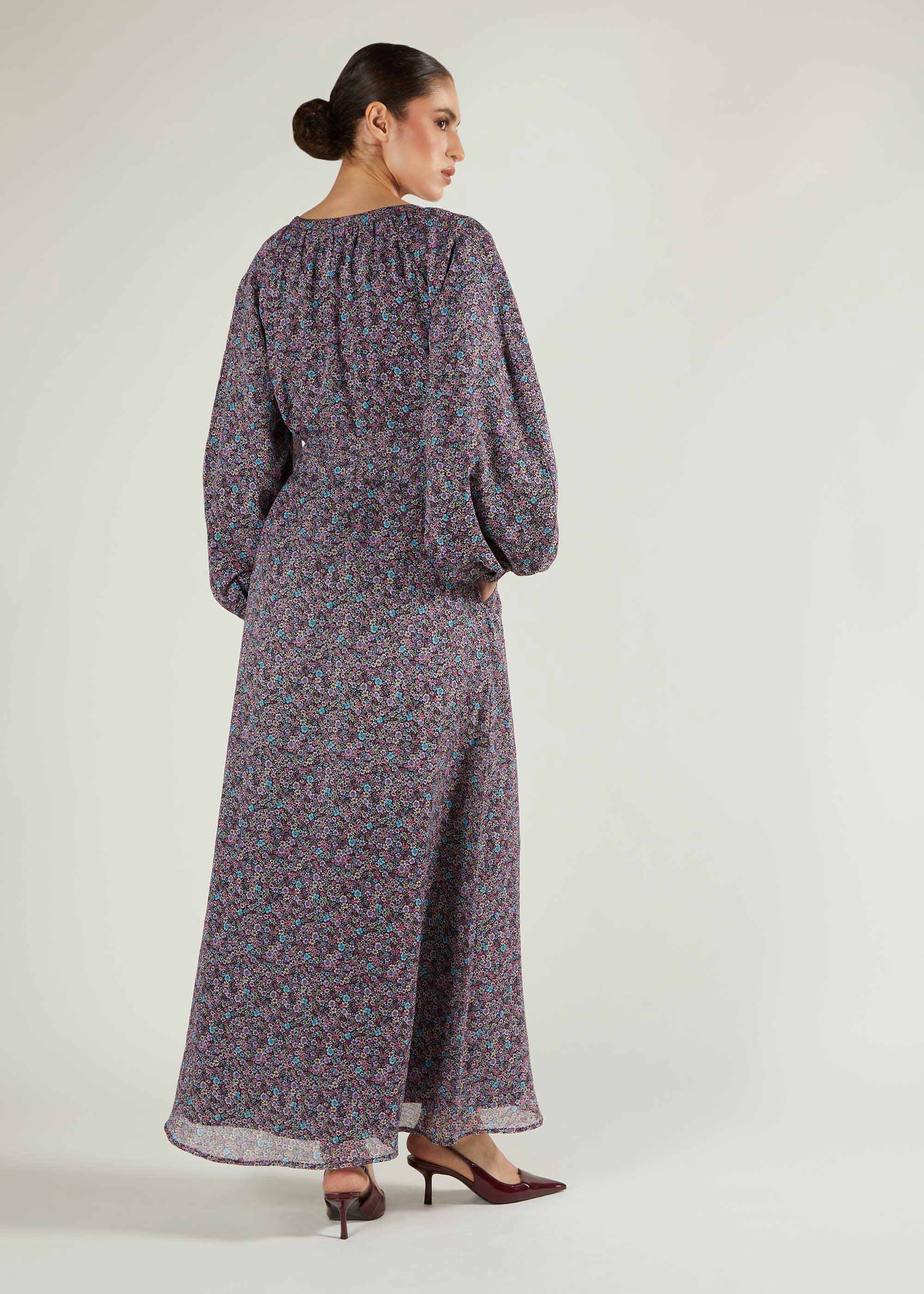 This fully lined maxi dress showcases a modest heart-shaped neckline with delicate pleating that extends to the shoulders. Its voluminous balloon sleeves enhance the sophisticated floral pattern in rich violet and mauve tones, accented with subtle blue hints. Included is a self-fabric belt, or you can choose to style it with your preferred belt. Wear it with heels for an elegant occasion or layer with long boots and a high-neck top for a stylish winter outfit.