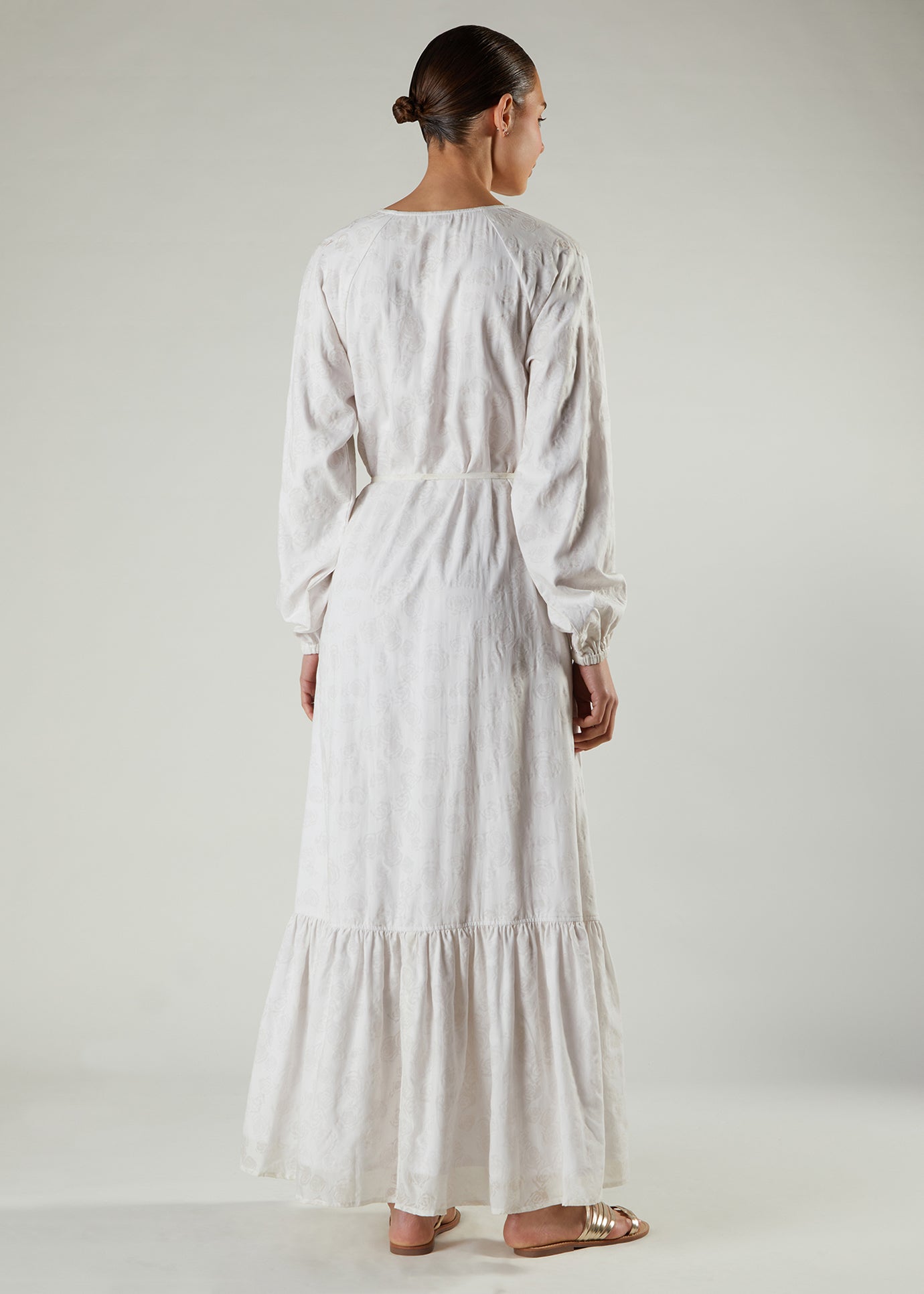 This Self-print maxi in elegant white cotton is fully lined and features a subtle floral print; it has a simple A line silhouette with a tiered bottom and self-fabric buttons to accentuate the maxi. Cinch in at the waist with the thin self-fabric belt.