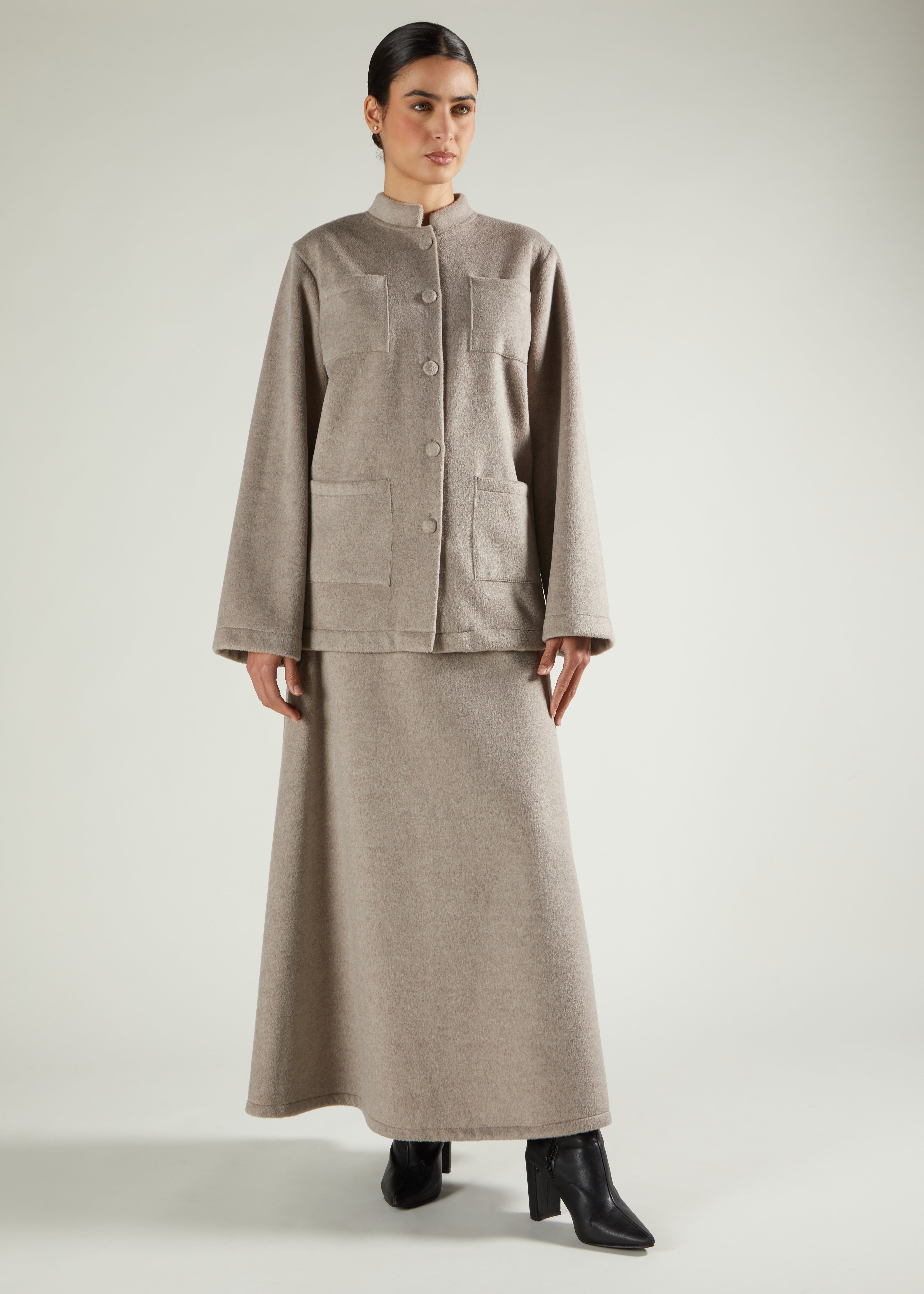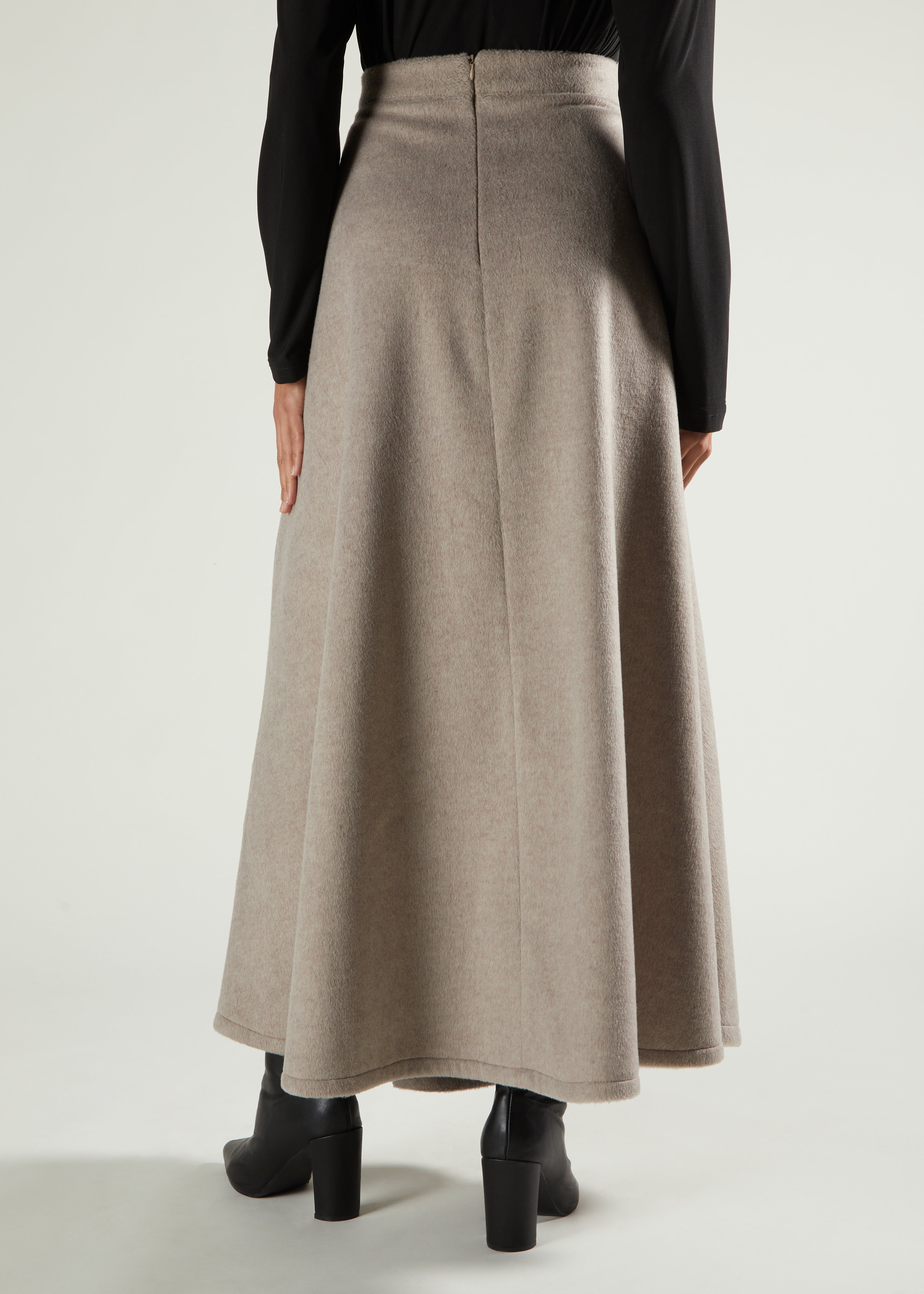 Cut from a structured, winter-appropriate fabric, this flared utility skirt offers a sleek pull-on design. It is expertly designed to complement the Utility Jacket or to stand out as an independent fashion statement.