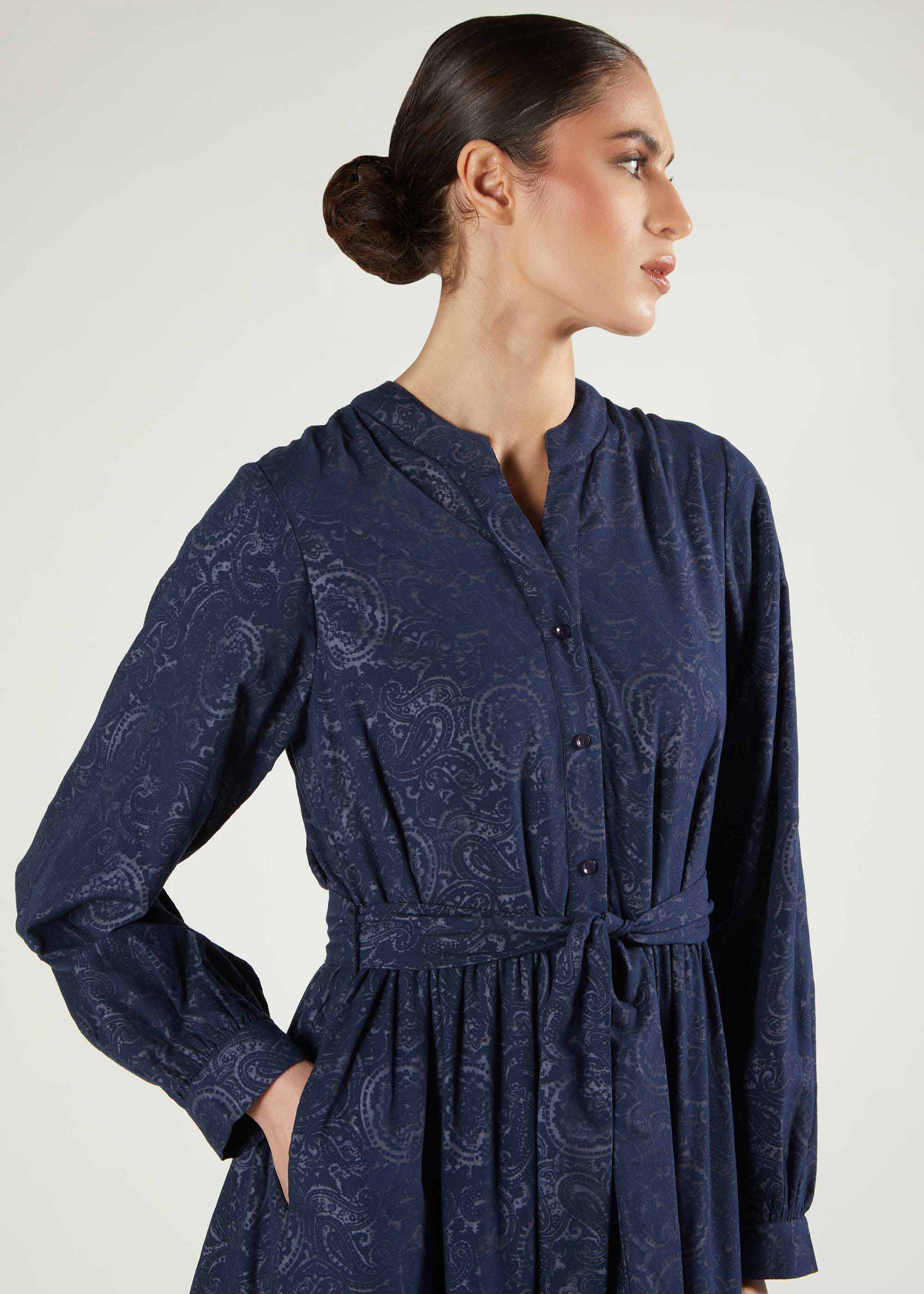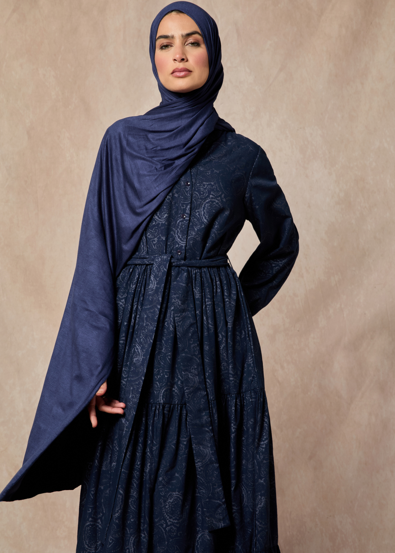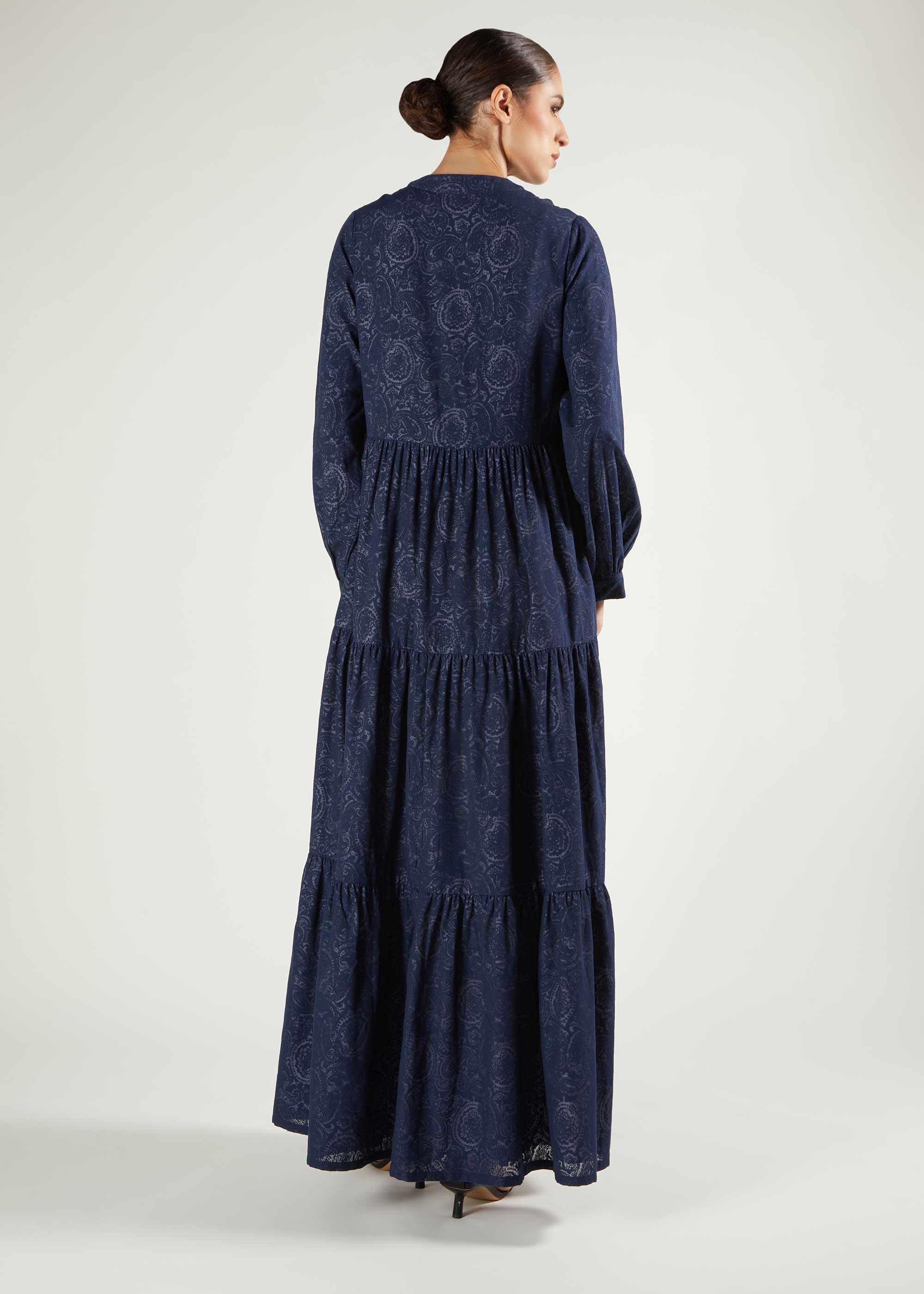 This elegant maxi is ideal for seasonal events, showcasing a self-printed paisley design in a rich navy colour. The lighter-toned lining underneath accentuates the intricate pattern, while the fully lined construction ensures complete coverage. Featuring a tiered silhouette, this maxi offers a flattering fit suitable for all your occasion wear needs throughout the season.